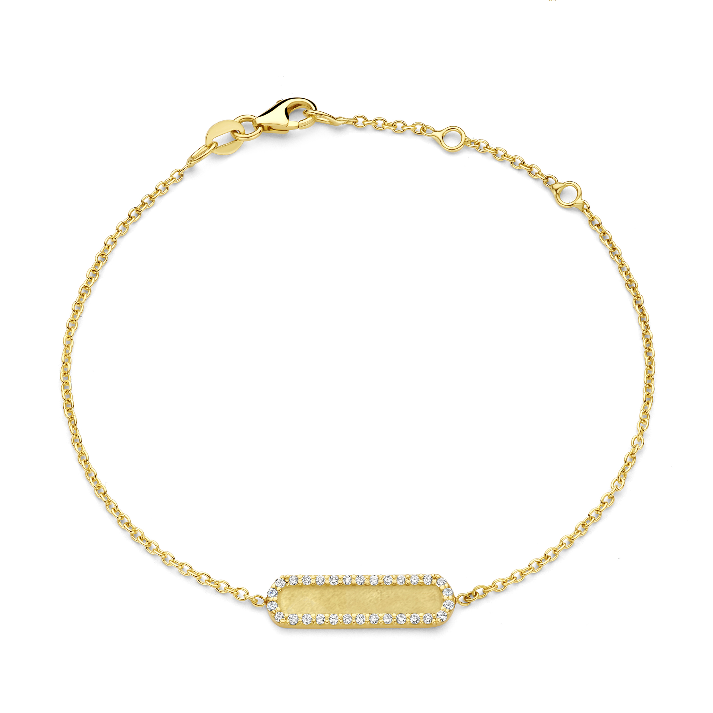 De pavé-diamanten in de rand zorgen voor een fonkelende afwerking en voegen een vleugje elegantie toe aan het tijdloze, ronde ontwerp.