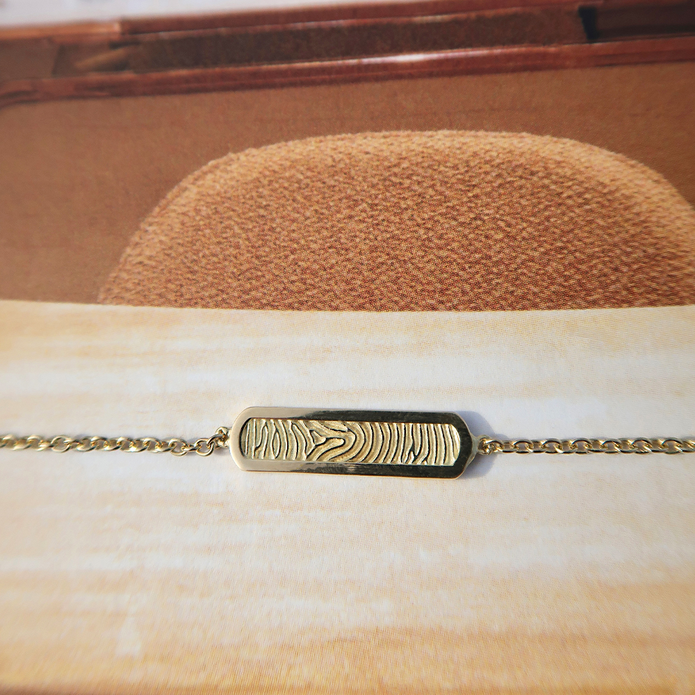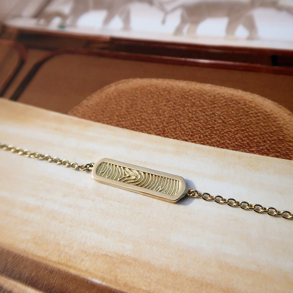 De afdruk wordt niet gelaserd, maar met innovatieve 3D-techniek in reliëf verwerkt, waardoor een tastbaar en voelbaar sieraad ontstaat.