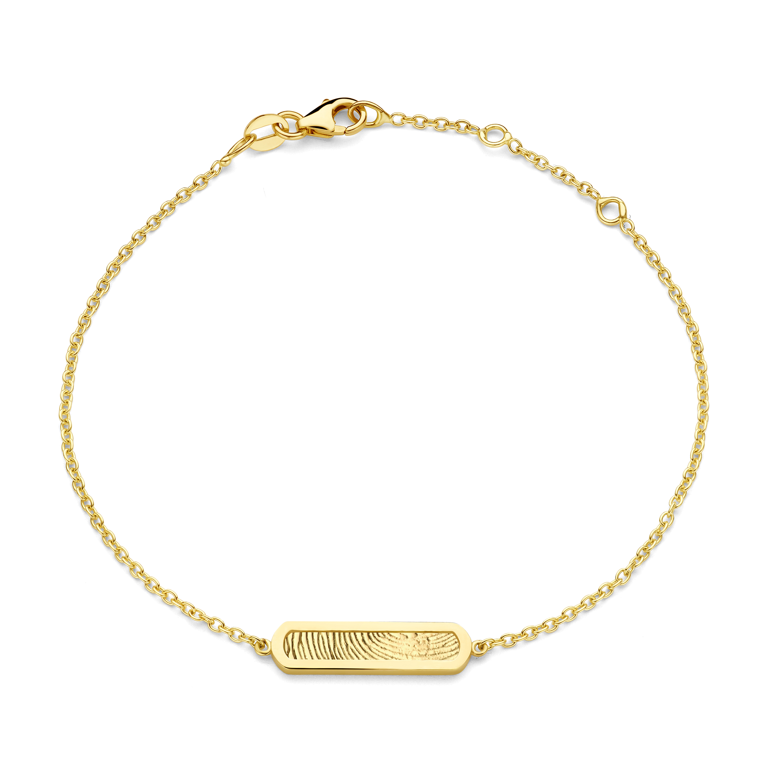 Deze 14-karaats gouden armband is voorzien van de elegante Bend bedel, die kan worden gepersonaliseerd met een persoonlijke 3D vingerafdruk.