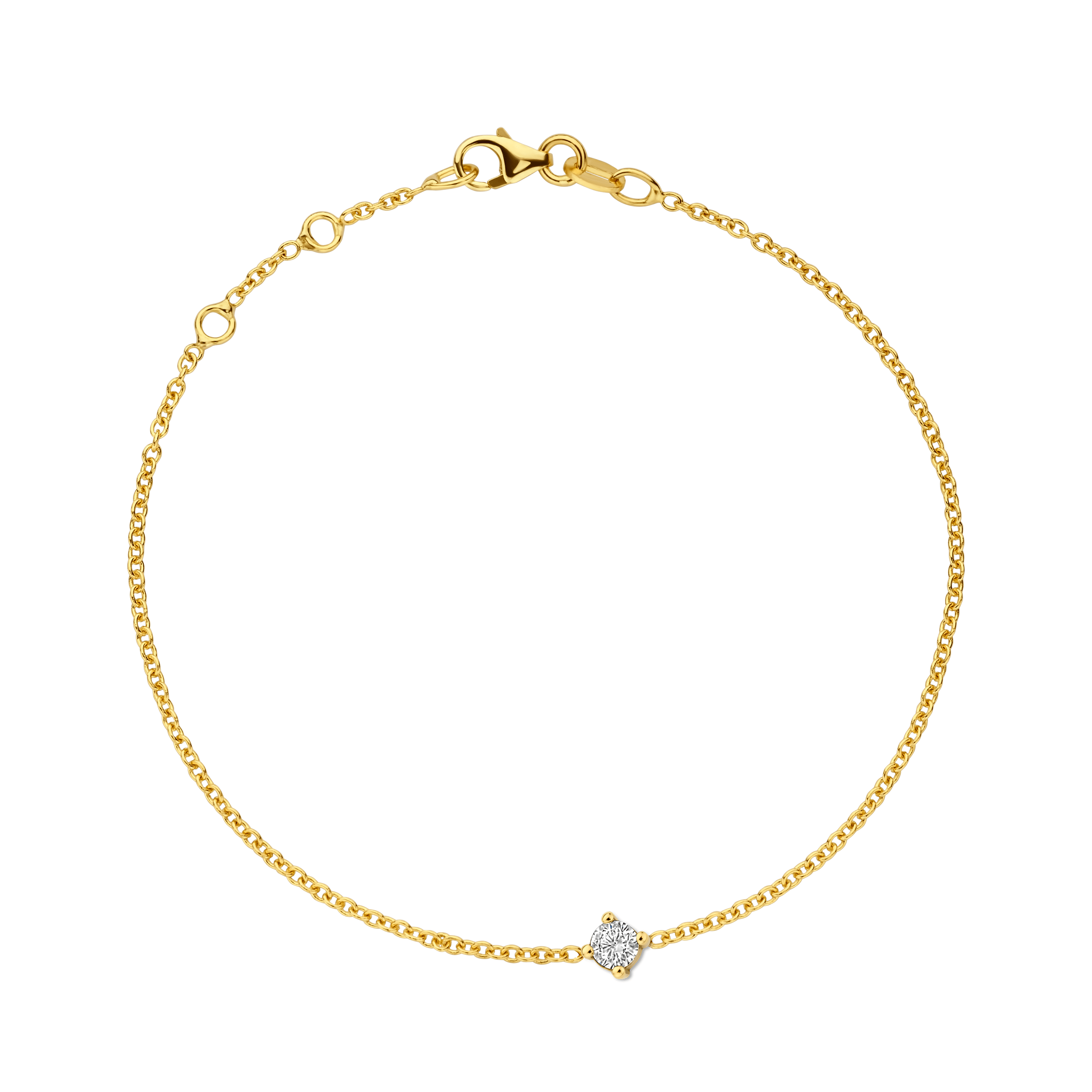 Deze prachtige armband is vervaardigd van hoogwaardig 14-karaats goud en is bezet met een schitterende diamant van 0.05 ct, gezet in een klassieke 4-poots chaton zetting.
