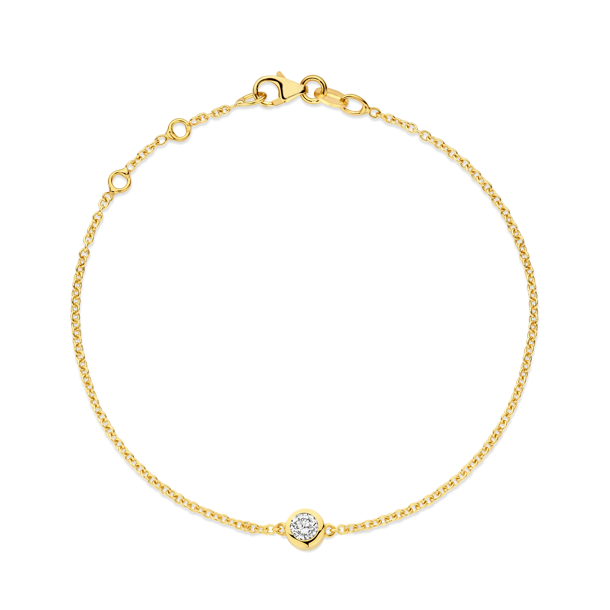 Deze prachtige armband is vervaardigd van hoogwaardig 14-karaats goud en is bezet met een schitterende diamant van 0.10 ct, gezet in een dichte ronde kast.
