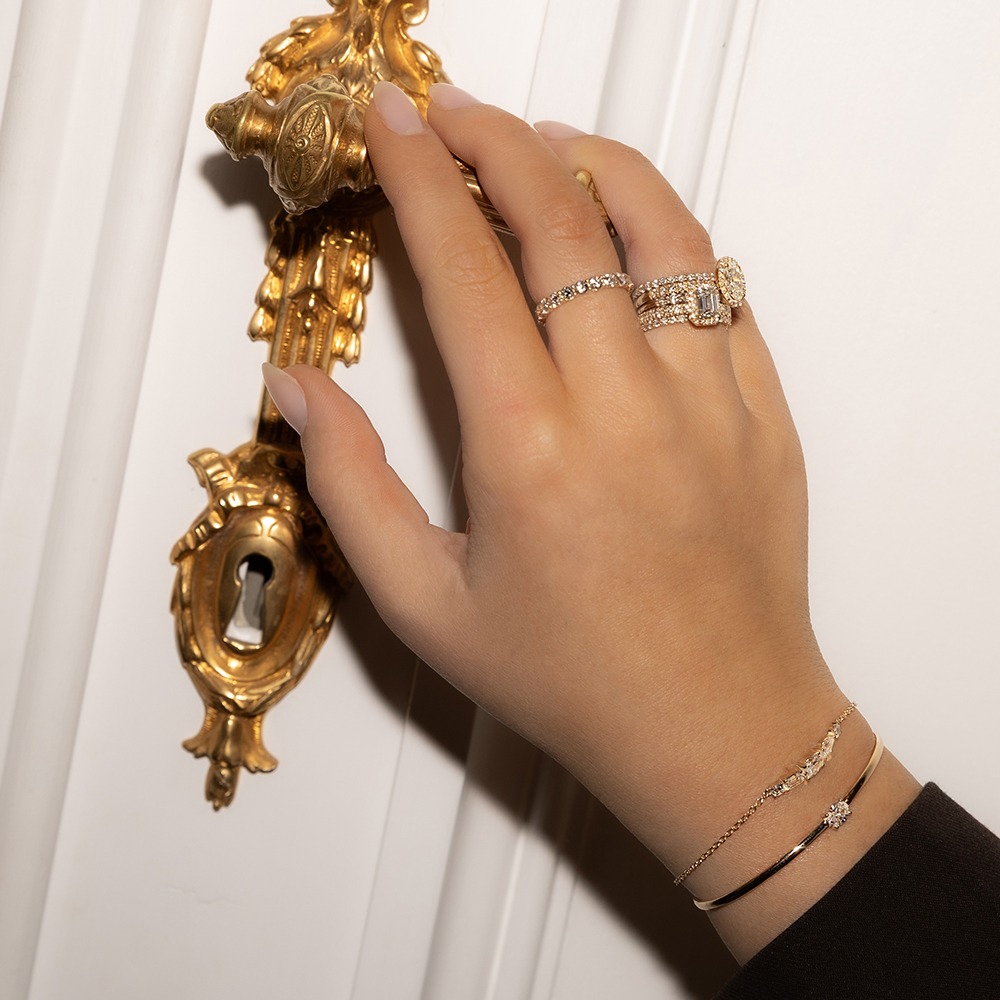 De verschillende slijpvormen zorgen voor een speels en sprankelend geheel. De diamanten vormen samen een mooi lijnenspel dat subtiel opvalt op de pols.