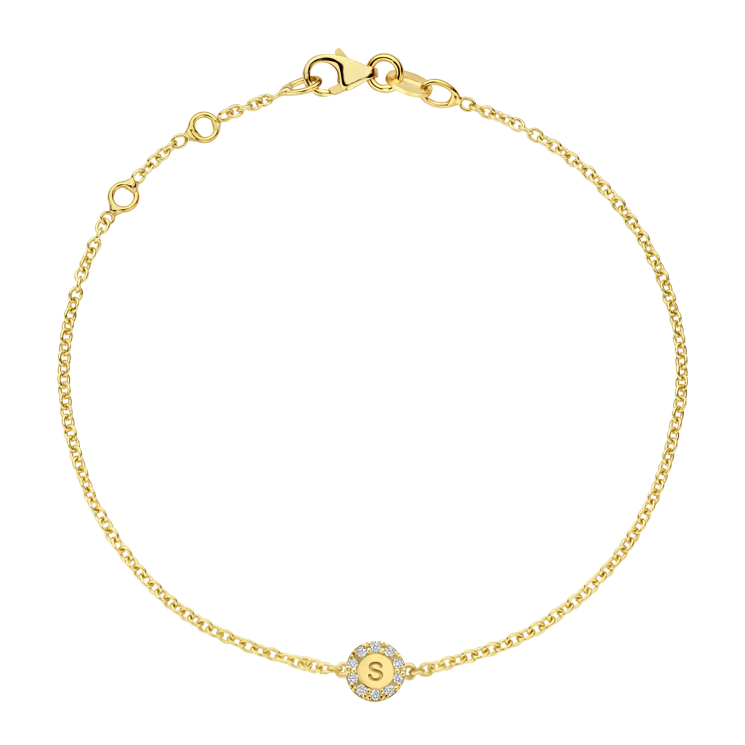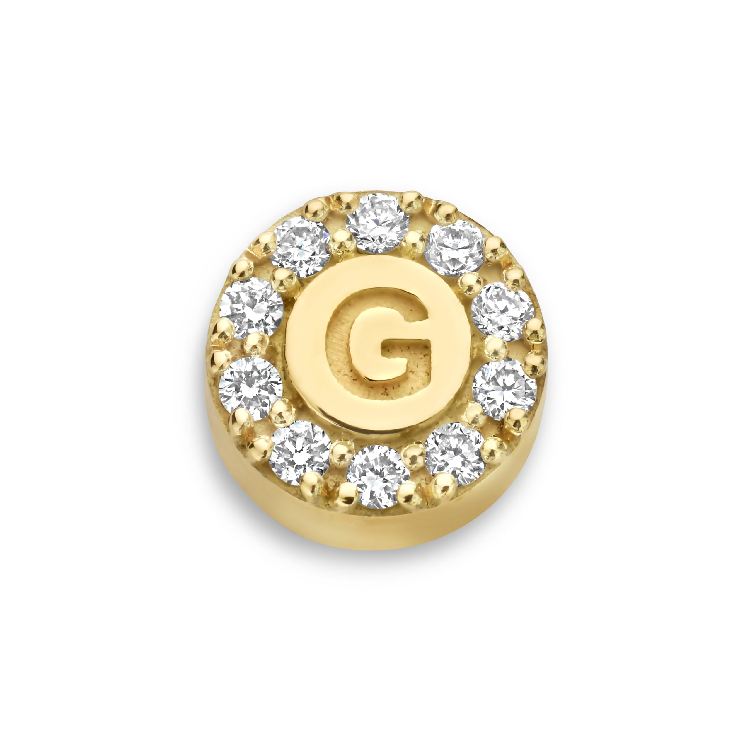 De tag is omlijst met een fijne halo van pavé gezette diamanten, met in het midden een initiaal of symbool naar jouw keuze.