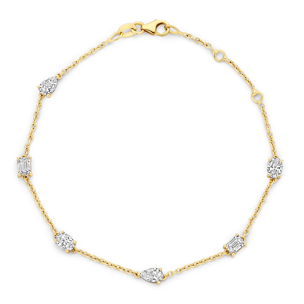 De combinatie van ovale, peer en emerald cut diamanten geeft de armband een moderne uitstraling en laat elke steen mooi tot zijn recht komen. Door de verdeling over de armband ontstaat een elegant detail dat rondom de pols zichtbaar is.