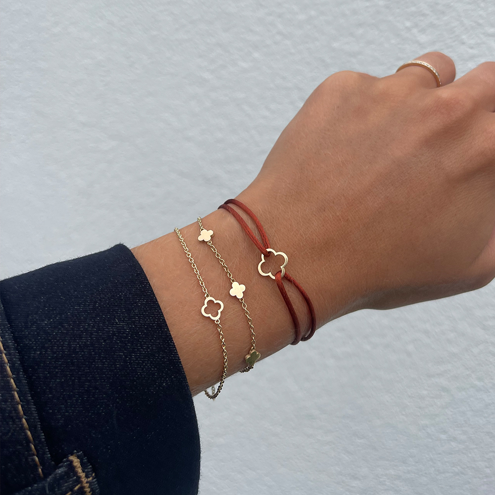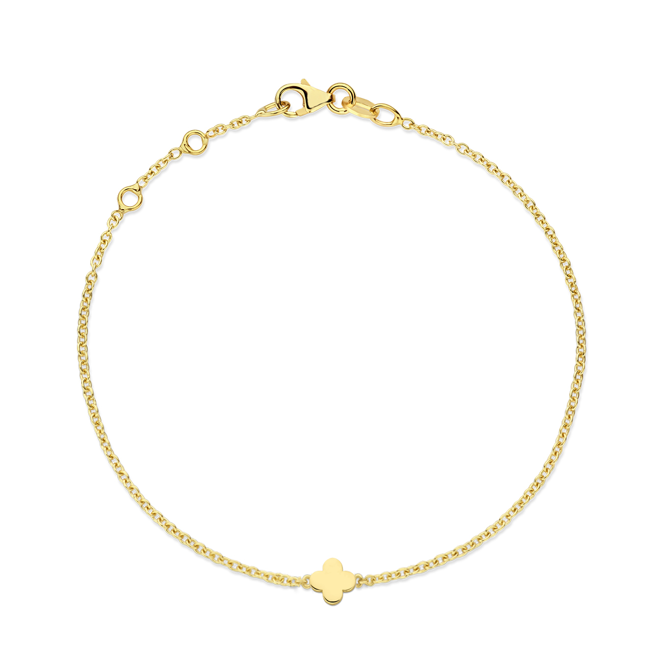 De armband Leaf Dicht combineert een verfijnde 14 karaats gouden armband met één dichte leaf-element, geïnspireerd op de klavervorm voor een subtiel, organisch accent.