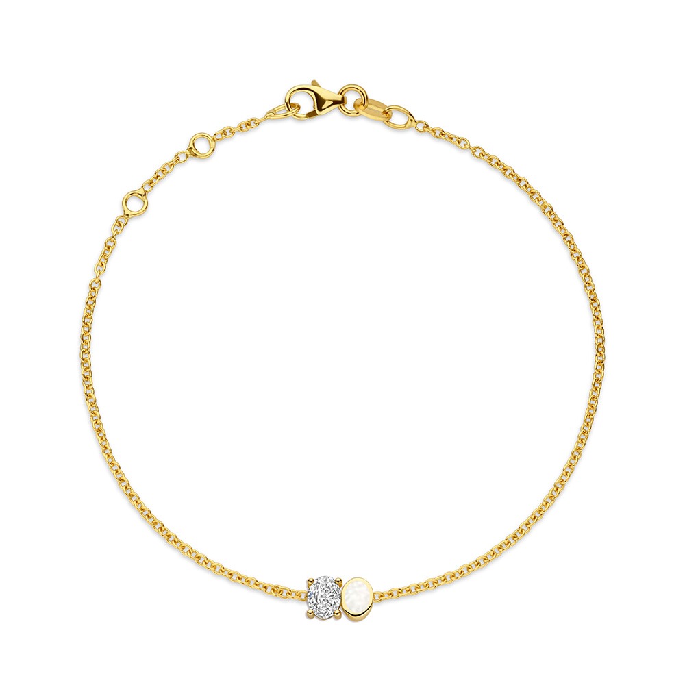 Een verfijnde armband van 14 karaats goud met een ovale lab grown diamant, met daarnaast een gouden ovaaltje met een momentkamer. De diamant is subtiel in de armband verwerkt en vormt samen met de herinneringskamer een bijzonder en persoonlijk detail.
