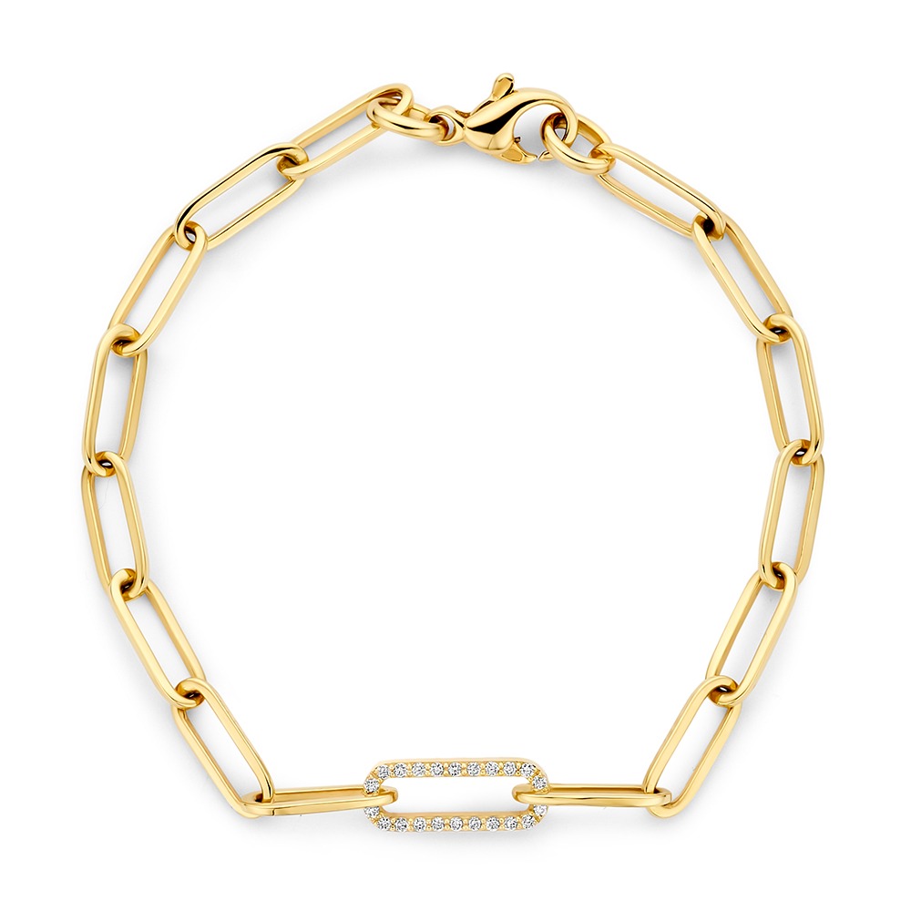 Een massieve armband van 14 karaats goud met een paperclip schakel. In het midden zit een Paperclipschakel die aan beide kanten bezet is met kleine pavé gezette diamanten.