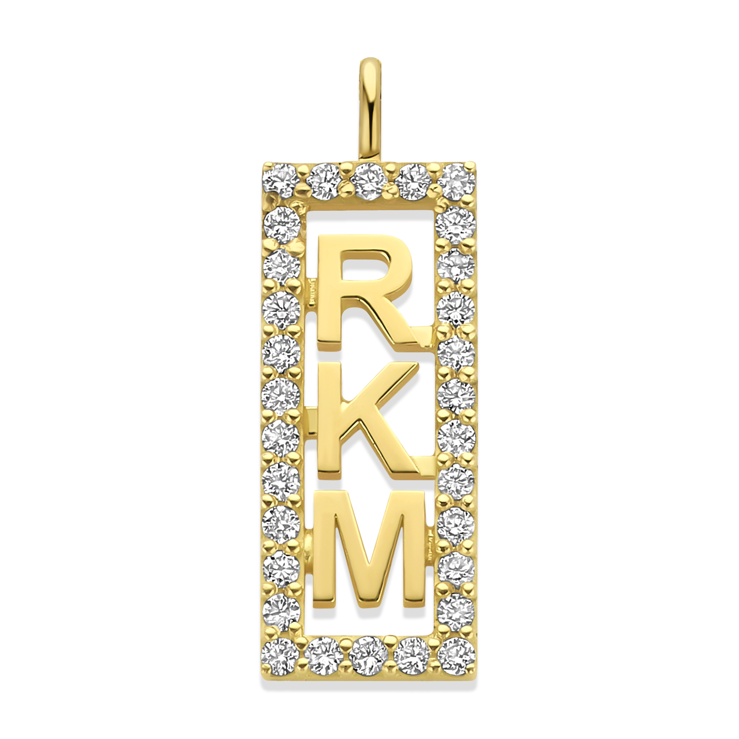 Deze pavé bezette hanger van 14 karaats goud biedt plek voor drie initialen of symbolen.