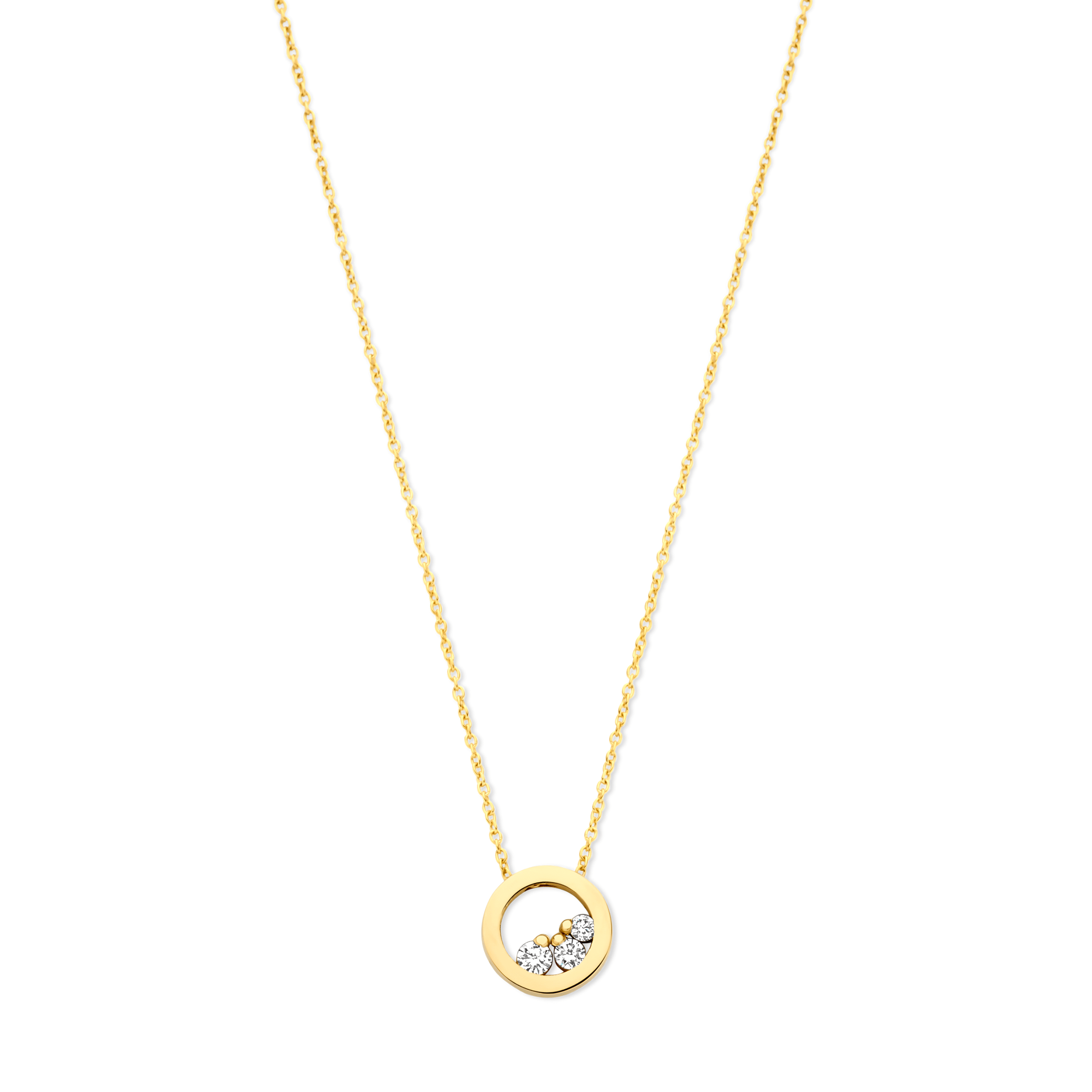 De ketting Circle Ascending is een speciale variant binnen onze collectie waarbij drie diamanten, met een totaalgewicht van 0.08 ct, oplopend liggen als middelpunt van de cirkel.