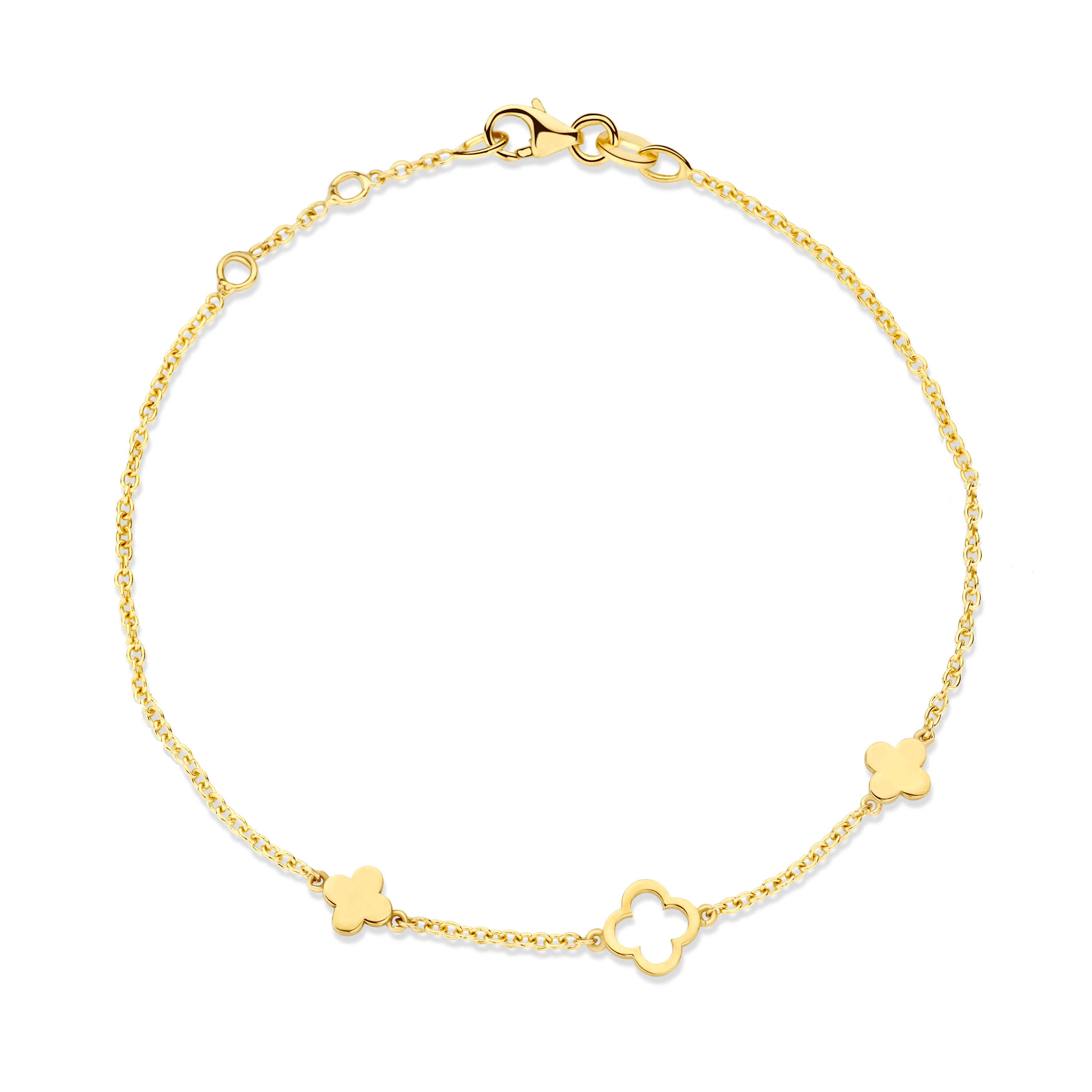 Deze prachtige armband bevat drie Leafs, geïnspireerd door de klavervorm, afwisselend met open en dichte Leafs.