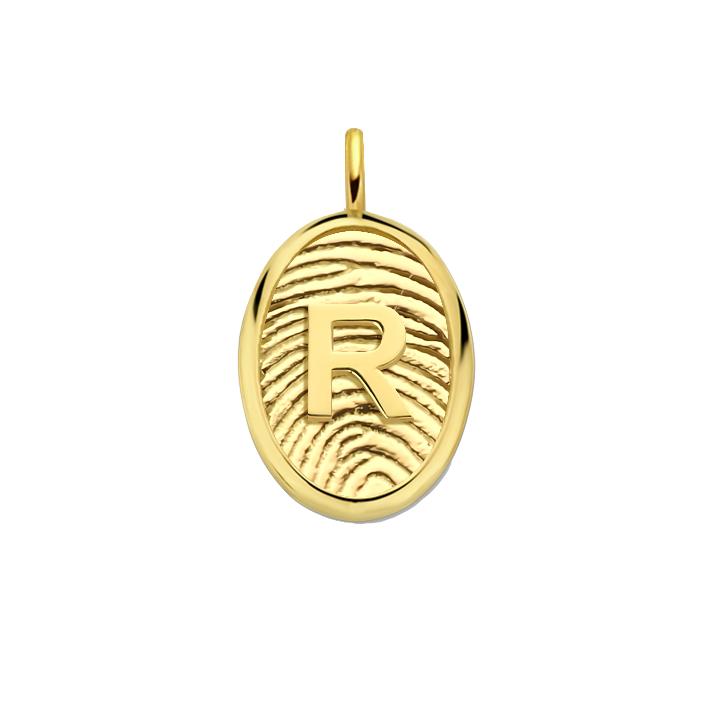 Deze tijdloze hangbedel is verkrijgbaar in 14 karaats goud en kan worden voorzien van een verfijnde 3D vingerafdruk én een initiaal naar keuze in het strakke Arial-lettertype.