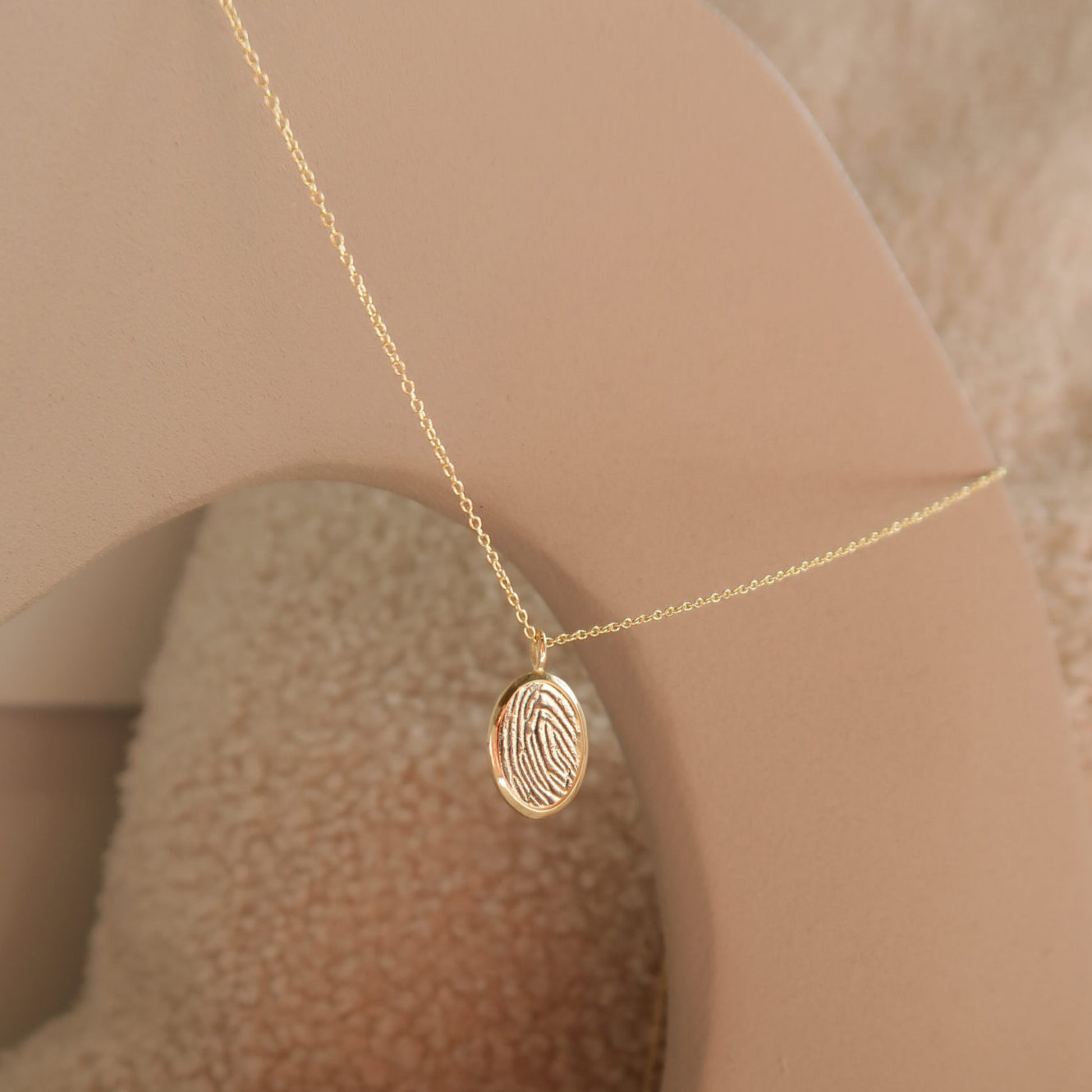 De geliefde Ovalia krijgt een unieke en persoonlijke twist. Deze tijdloze hangbedel is gemaakt van 14 karaats goud en kan worden voorzien van een verfijnde 3D-vingerafdruk. In plaats van een gravure wordt de afdruk niet gelaserd, maar met innovatieve 3D-techniek in reliƫf verwerkt. Het resultaat is een tastbaar sieraad met een warme en elegante uitstraling, een voelbare herinnering die je altijd dichtbij draagt.