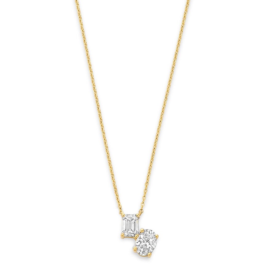Een verfijnde ketting van 14 karaats goud met een Toi et Moi effect van twee 0.50 ct lab grown diamanten. De hanger combineert een ovale diamant met een emerald cut diamant, waardoor een speels en elegant geheel ontstaat.