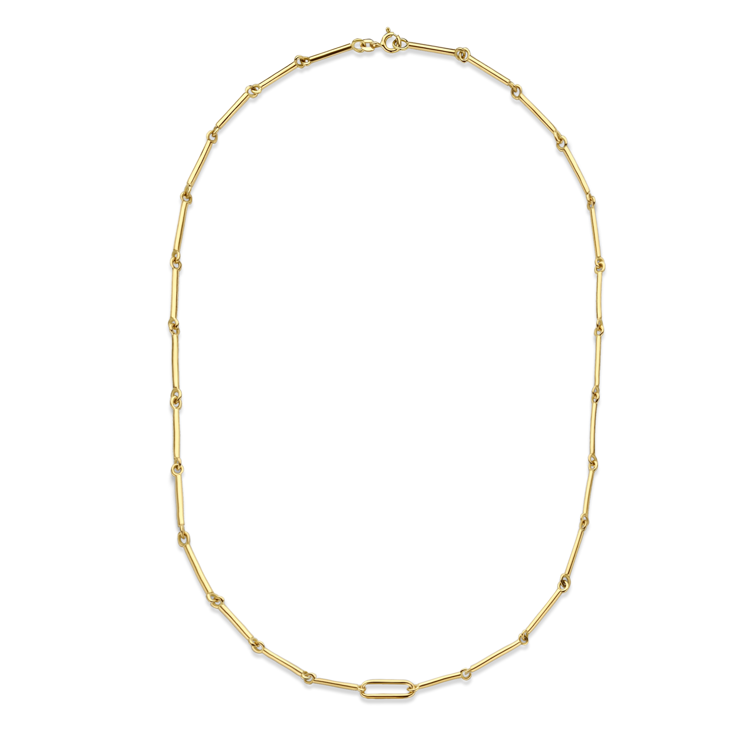Deze ketting van 14 karaats goud heeft een unieke, fijne structuur die doet denken aan bamboe, subtiel maar met nét dat beetje extra. Draag hem los voor een minimalistische look of voeg een bedel toe die bij jou past, van initialen tot symbolen vol betekenis. Prachtig op zichzelf, maar ook ideaal als basis voor jouw persoonlijke combinatie.