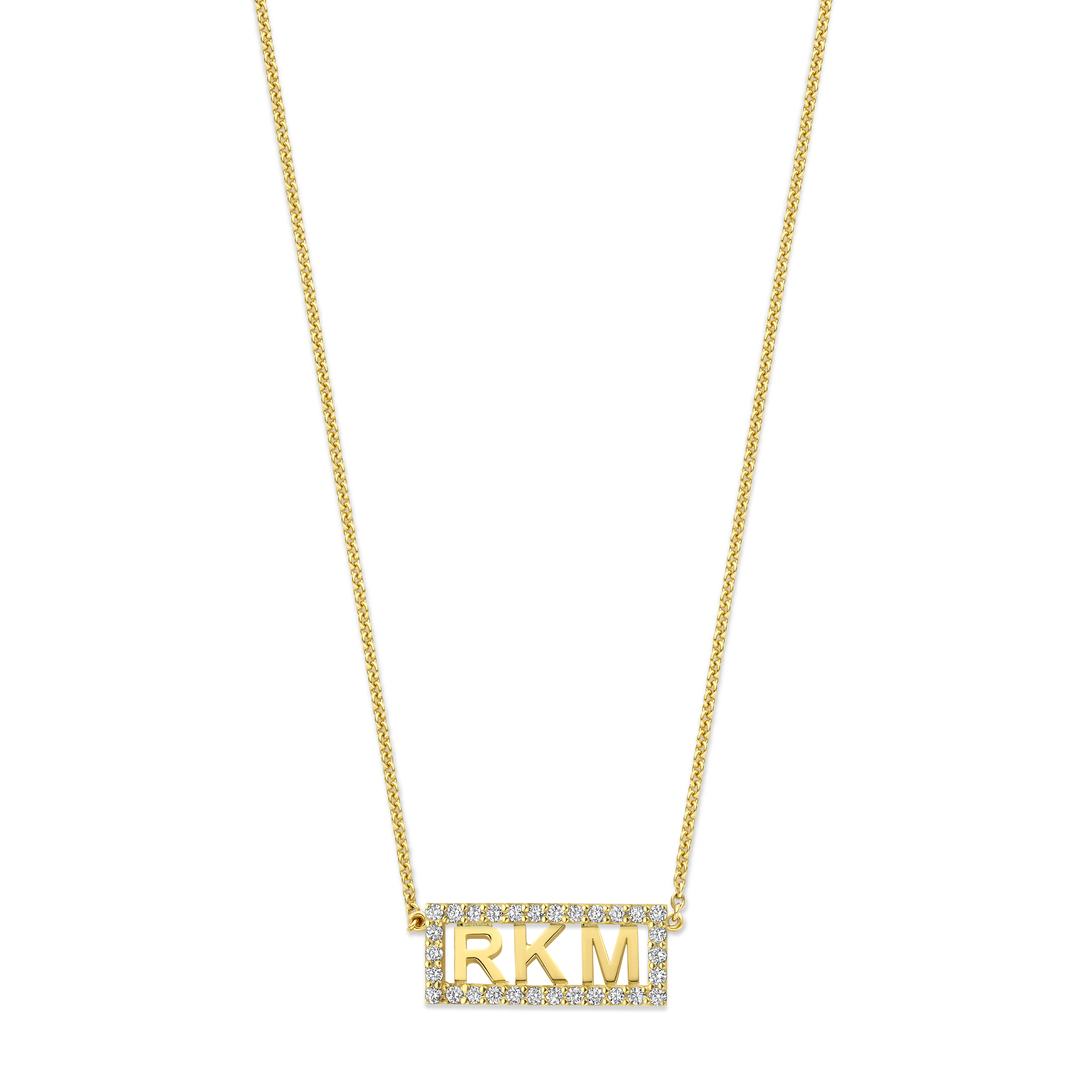 Deze ketting heeft een elegante rechthoekige bedel, waarin plaats is voor drie initialen. Het ontwerp wordt geaccentueerd door de sprankeling van pavé diamanten, die samen zorgen voor een tijdloze en persoonlijke uitstraling.