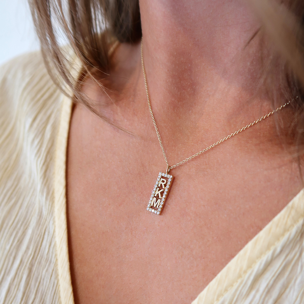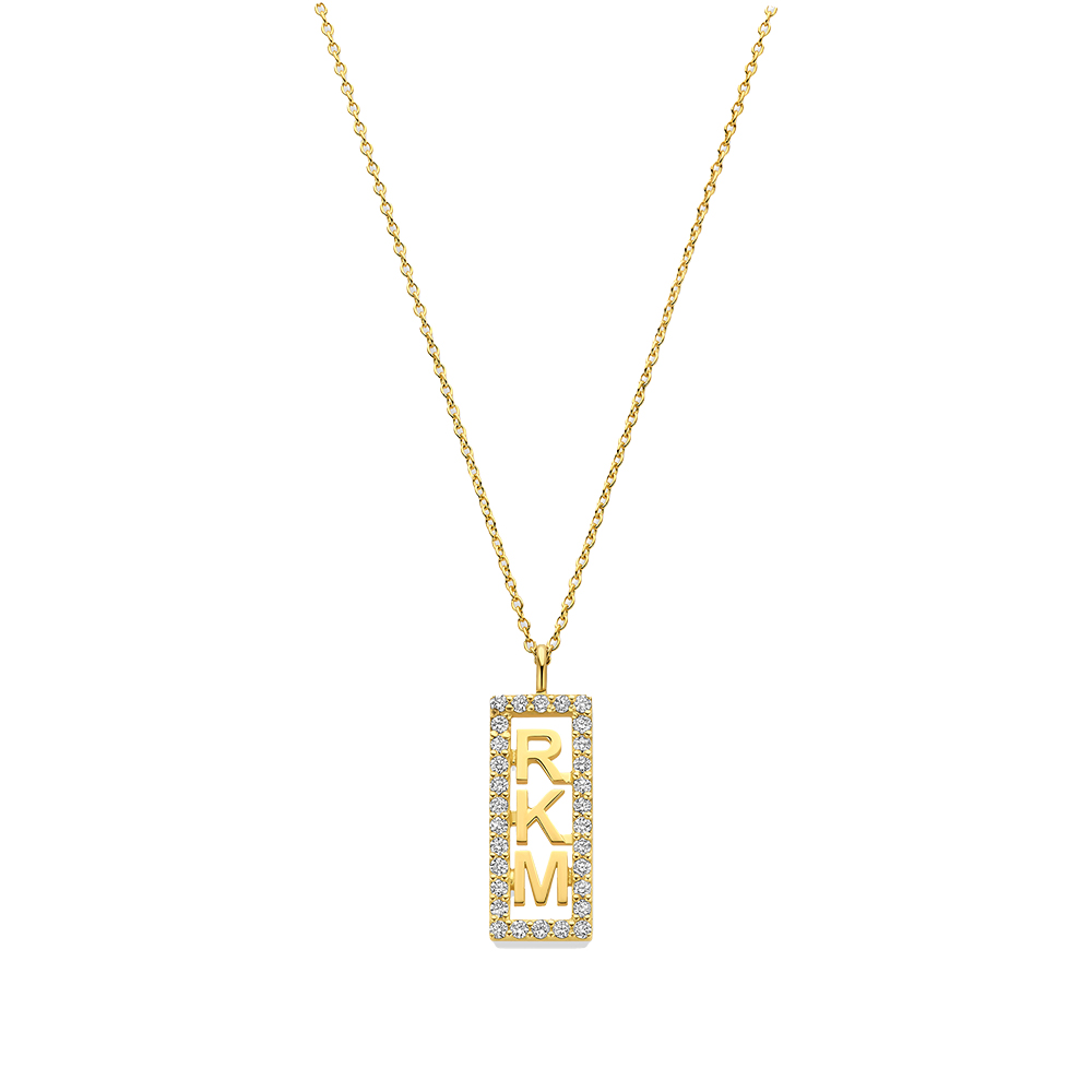 De ketting bestaat uit een pavé bezette hanger van 14 karaats goud die plek biedt voor drie initialen of symbolen.