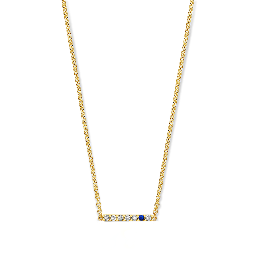De ketting Diamondbar Milestone is vervaardigd uit 14 karaats goud en heeft een staafvormig element dat tussen de ketting is verwerkt, pavé bezet met zes witte diamanten en één geboortesteen naar keuze.
