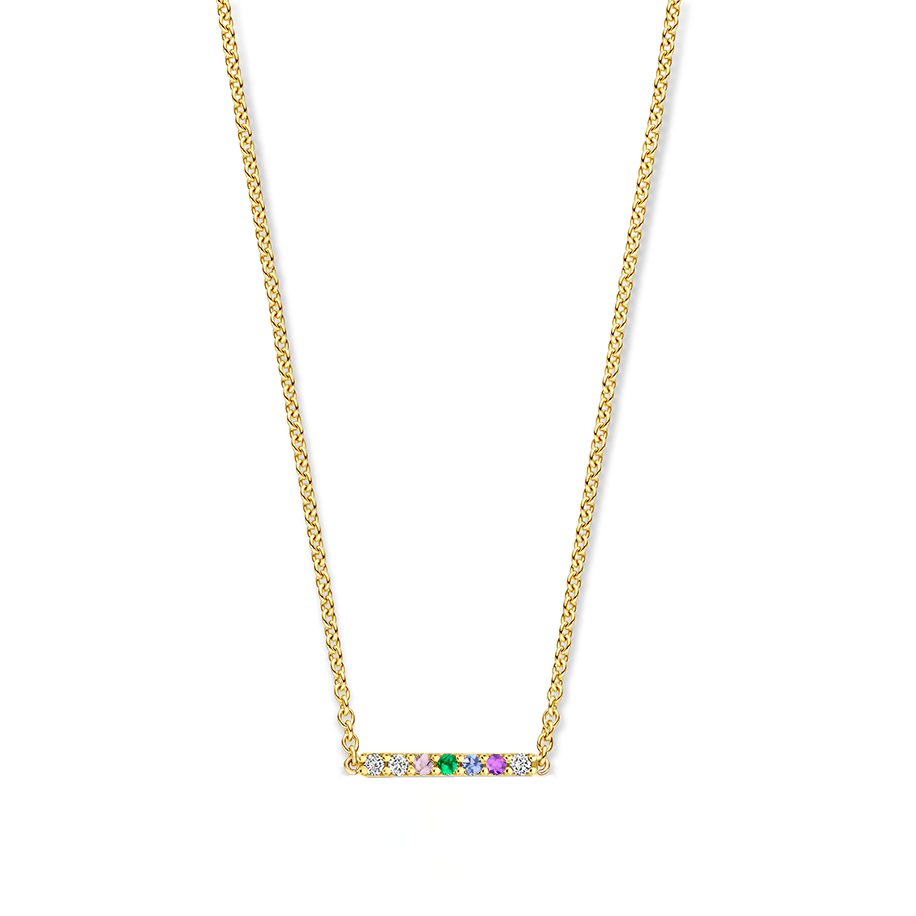 De ketting Diamondbar Milestone is gemaakt van 14 karaats goud en heeft een gouden staafje dat tussen de ketting zit, pavé bezet met drie witte diamanten en vier geboortestenen naar keuze.