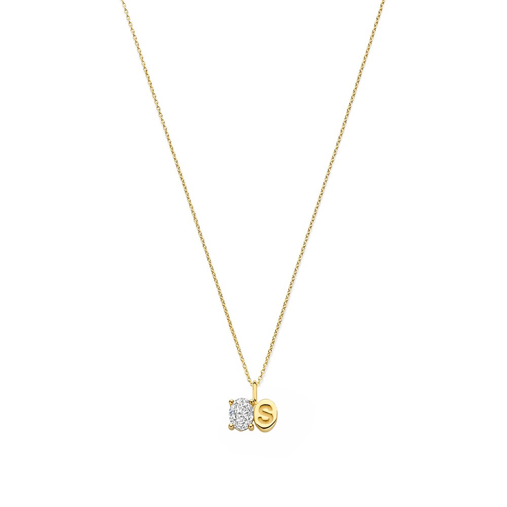Een verfijnde ketting van 14 karaats goud met een hanger bestaande uit een ovale lab grown diamant en een gouden ovaaltje waarop een initiaal geplaatst kan worden. De hanger valt subtiel onder de ketting, waardoor de diamant en de persoonlijke letter mooi samen naar voren komen.