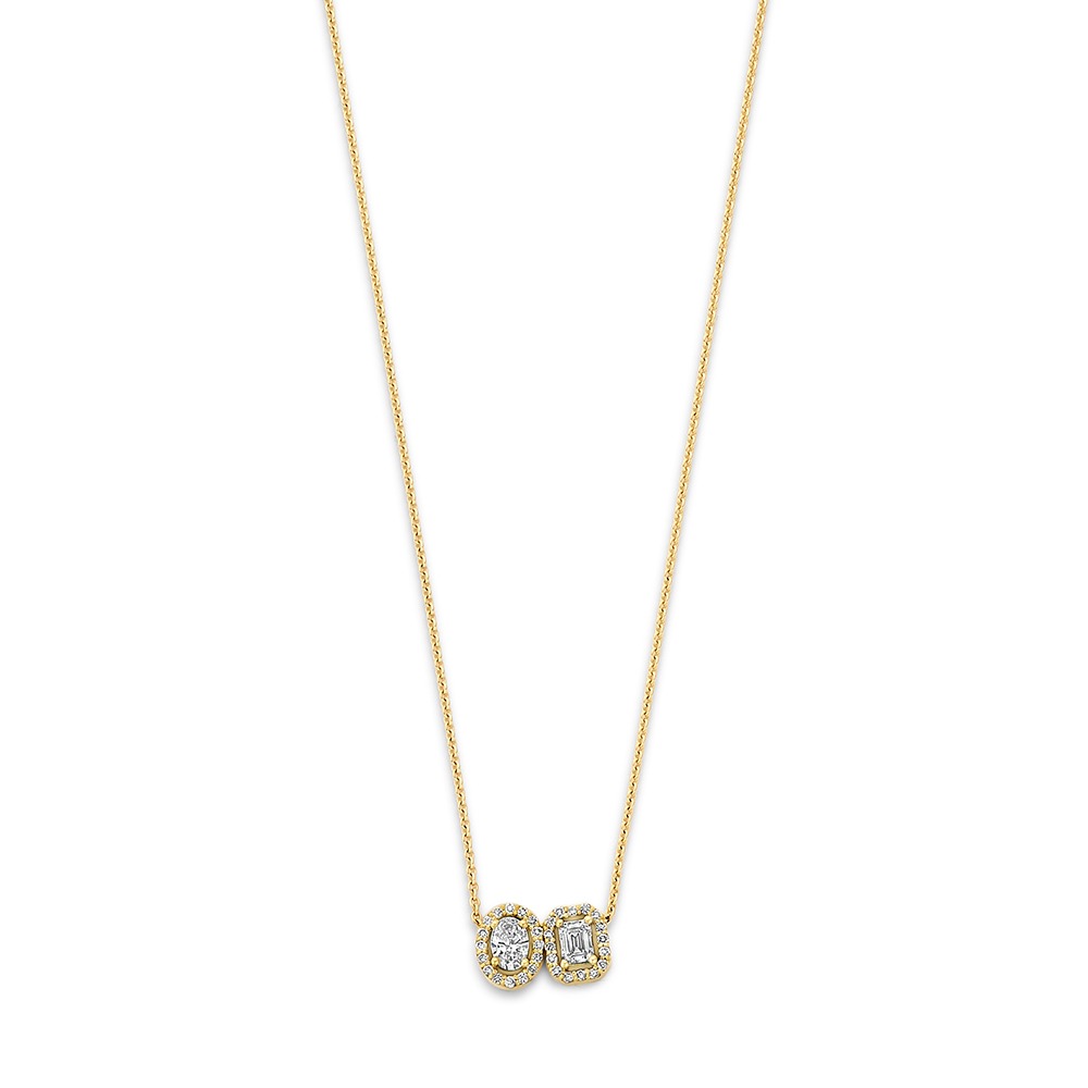 Een verfijnde ketting van 14 karaats goud met twee halo lab grown bedels naast elkaar.