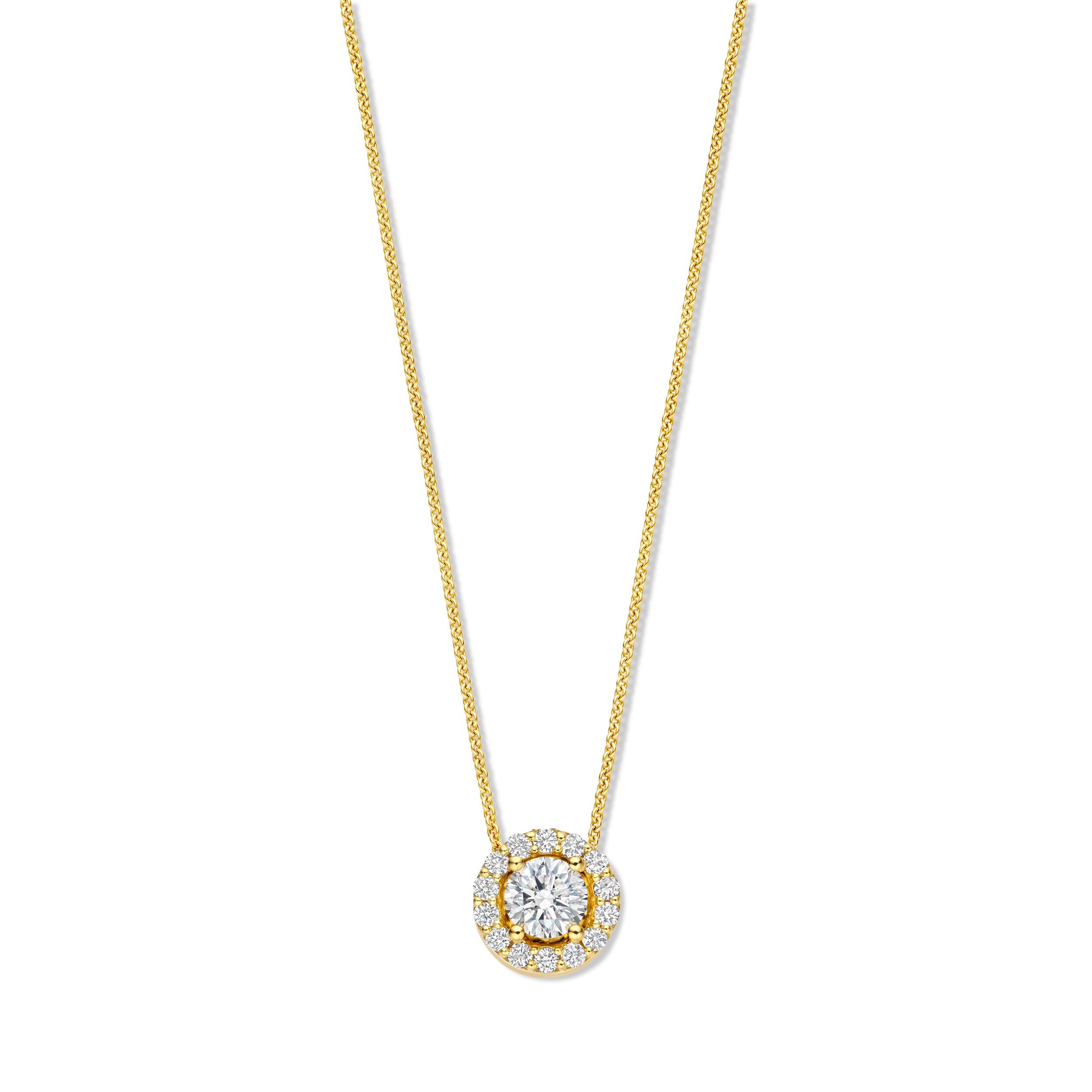 De Halo ketting heeft een natuurlijke diamant van 0.25 ct in het midden. Rondom de diamant zit een rand van kleine diamanten, ook wel een halo genoemd. Deze zorgen ervoor dat de middelste steen extra mooi opvalt en nog meer schittert.