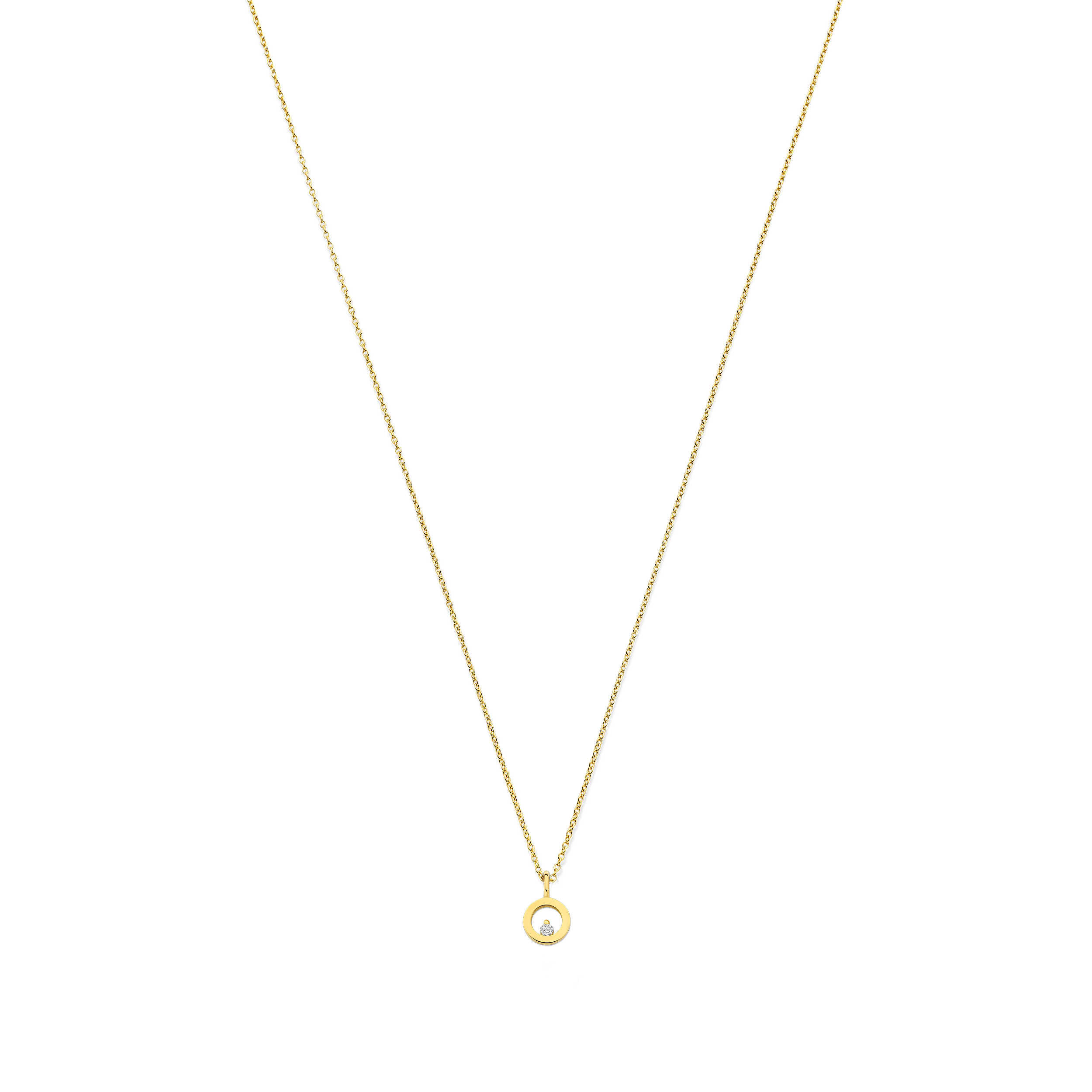 De cirkelhanger schittert subtiel met een diamantje van 0.03 ct.