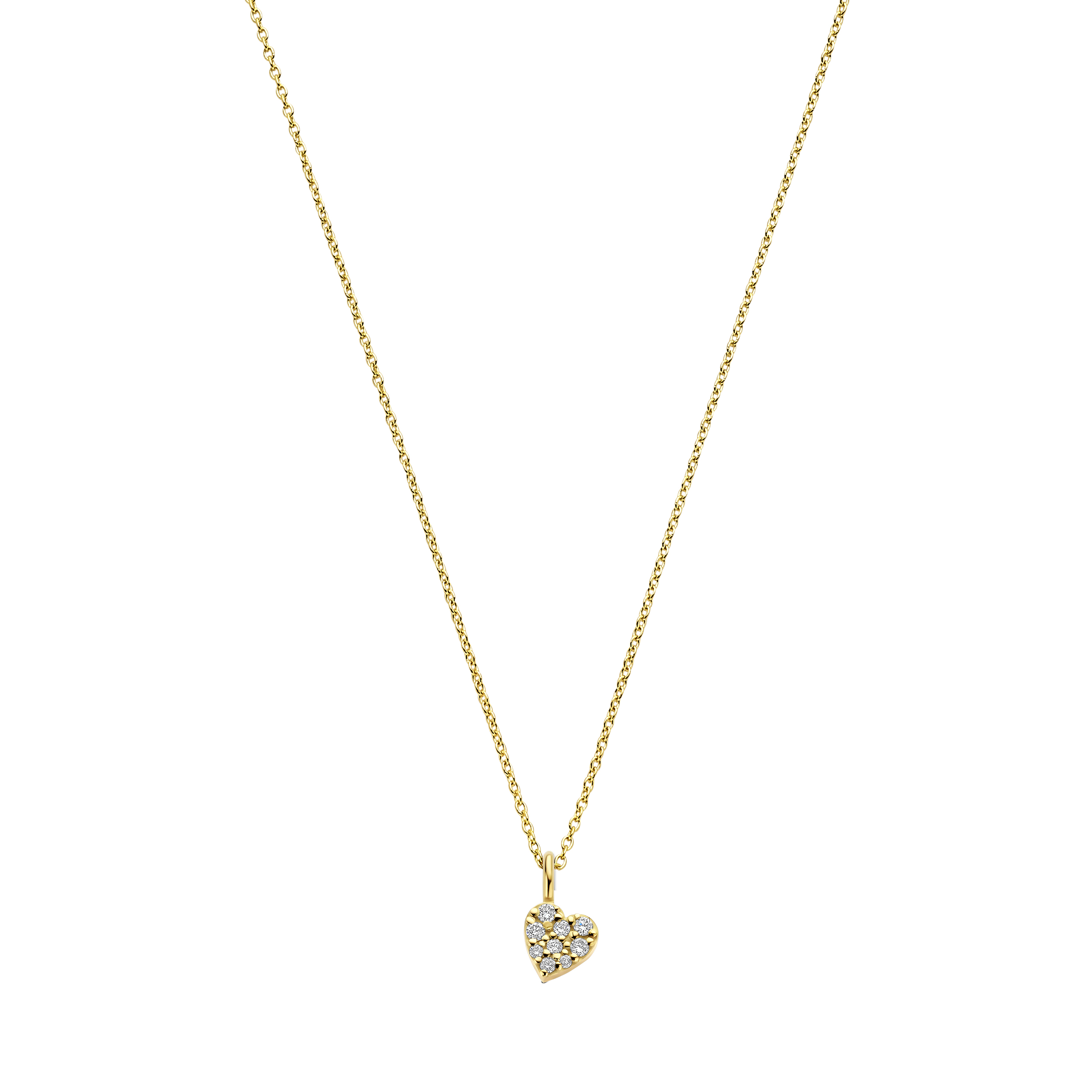 Deze 14 karaats gouden ketting is voorzien van het hangsymbool hart pavé: een hartvormige bedel helemaal bedekt met fijne pavé-gezette diamanten die fonkelen bij elke beweging.
