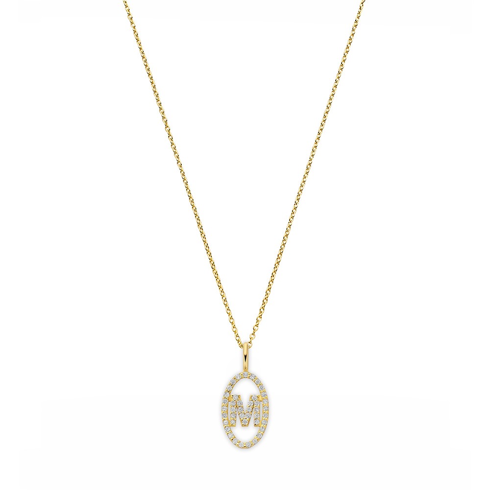 Een verfijnde ketting van 14 karaats goud met een ovale hanger. De hanger is omringd door een halo van kleine diamanten en in het midden staat een pavé bezette initiaal.