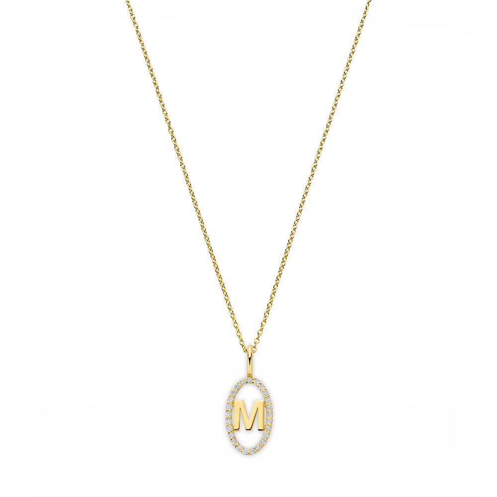 Een verfijnde ketting van 14 karaats goud met een ovale hanger. De hanger is omringd door een halo van kleine diamanten en heeft in het midden ruimte voor een persoonlijke initiaal.