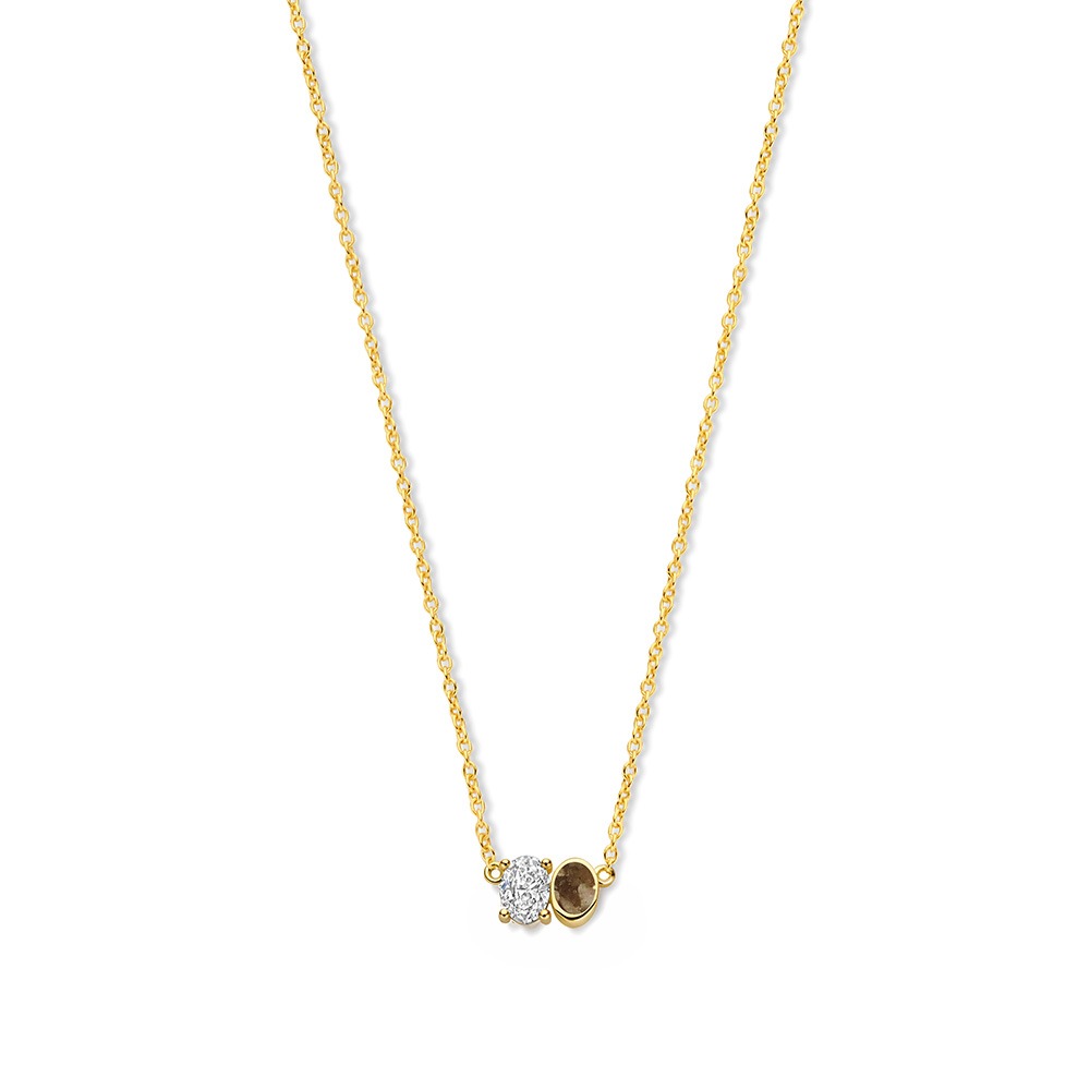 Een verfijnde ketting van 14 karaats goud met een ovale lab grown diamant, met daarnaast een kleine ovale lege kamer die gevuld kan worden met as of moedermelk. De diamant is subtiel in de ketting verwerkt en vormt samen met de momentkamer een bijzonder en persoonlijk detail.