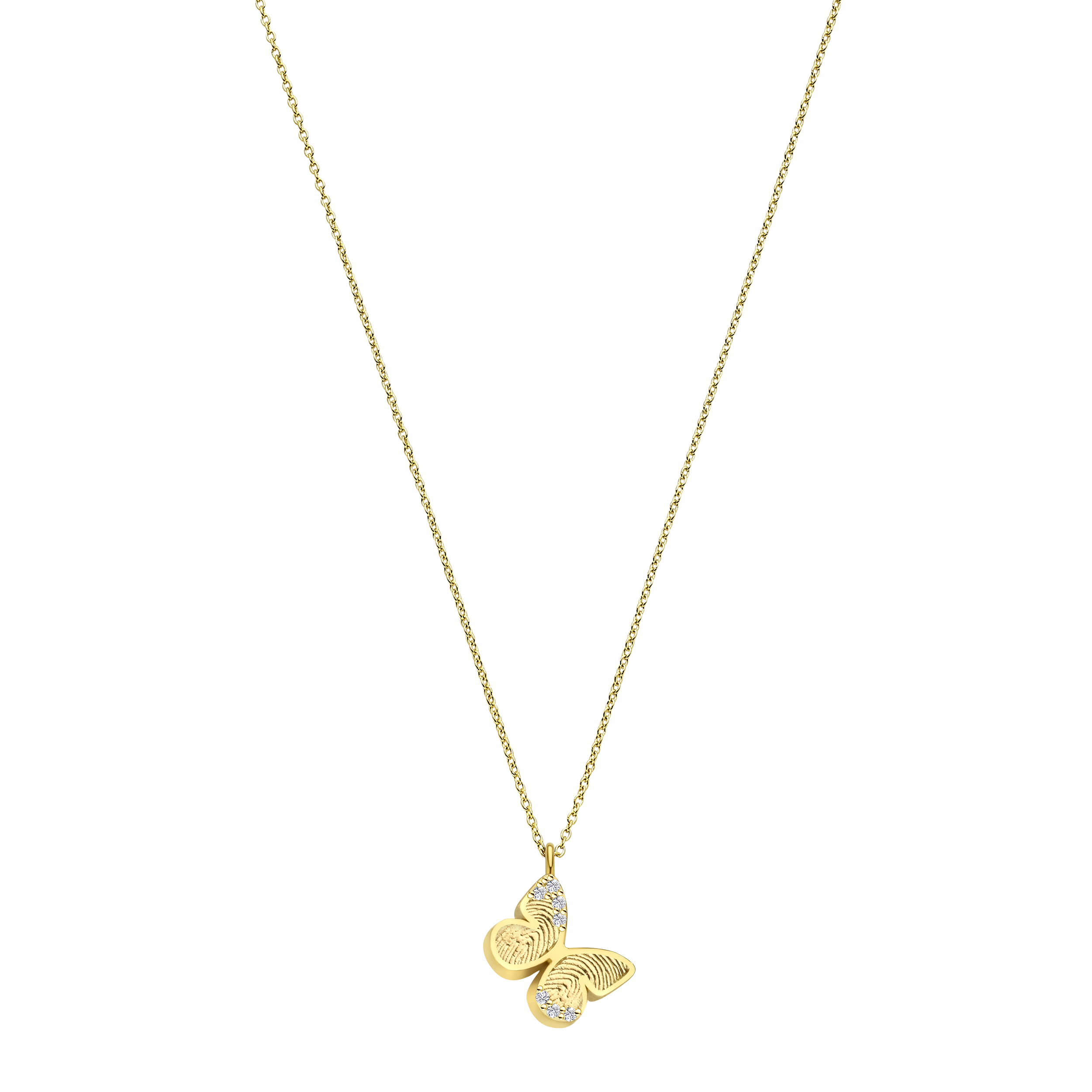 Deze verfijnde ketting is gemaakt van 14 karaats goud en voorzien van een grotere vlinderhanger die kan worden gepersonaliseerd met een unieke 3D-vingerafdruk. De afdruk wordt niet gelaserd, maar met innovatieve 3D-techniek in reliëf verwerkt, waardoor een tastbaar en voelbaar sieraad ontstaat. De vleugels zijn verrijkt met subtiele diamanten die de hanger een fonkelende en luxueuze uitstraling geven. De combinatie van de elegante vlindervorm, de persoonlijke vingerafdruk en de schitterende diamanten maakt dit sieraad tot een bijzonder herinneringssieraad, een liefdevol symbool dat dierbare momenten altijd dichtbij houdt.