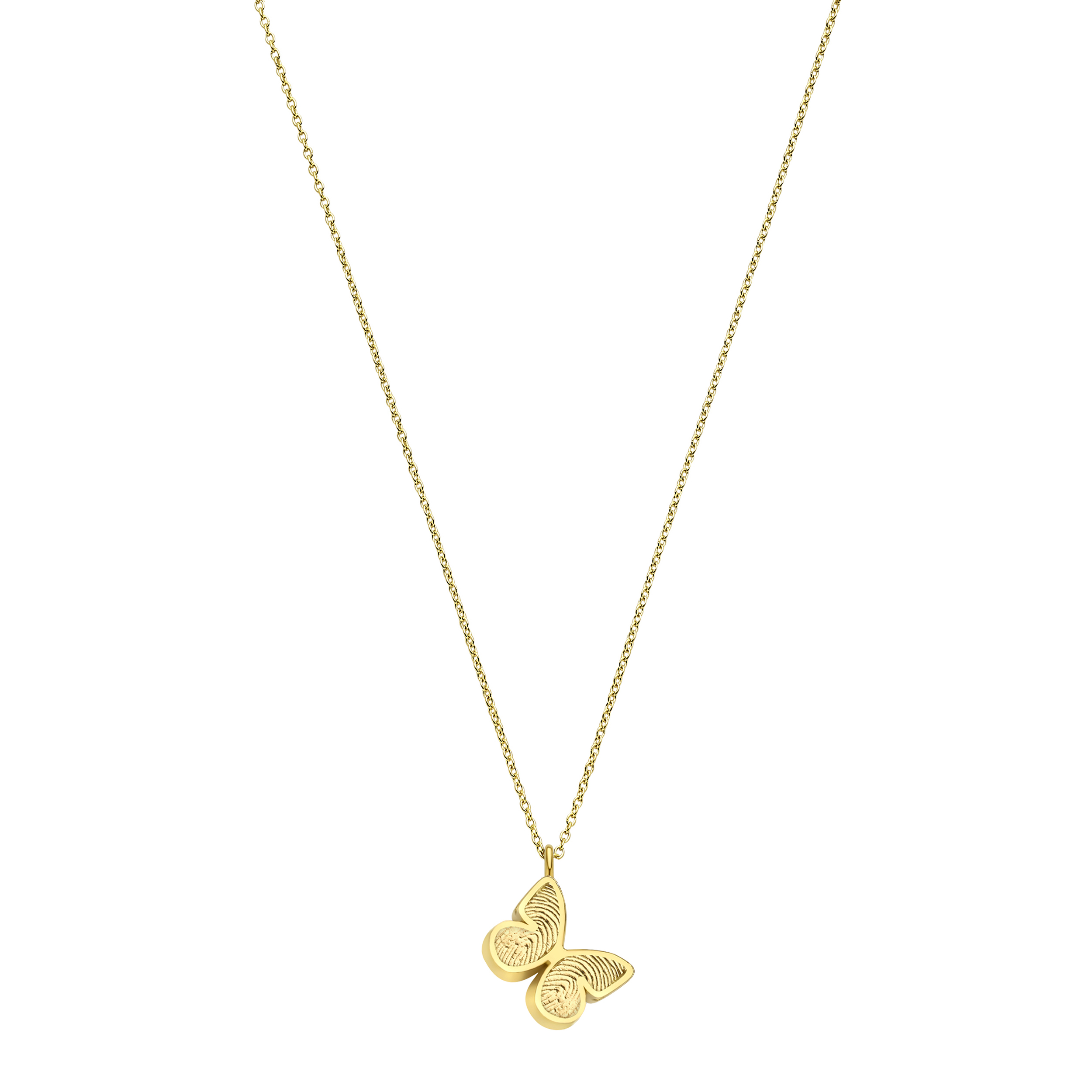 Deze elegante ketting is voorzien van een grotere vlinderhanger van 14 karaats goud die kan worden gepersonaliseerd met een verfijnde 3D-vingerafdruk. De afdruk wordt met innovatieve 3D-techniek in reliƫf verwerkt, waardoor een tastbaar en voelbaar sieraad ontstaat dat warmte en emotie uitstraalt. Door de grotere vorm komen zowel de sierlijke vlindervorm als de persoonlijke vingerafdruk nog sterker tot hun recht. Zo wordt dit sieraad een bijzonder en betekenisvol herinneringssieraad, een symbool van liefde en verbondenheid dat je altijd dichtbij draagt.