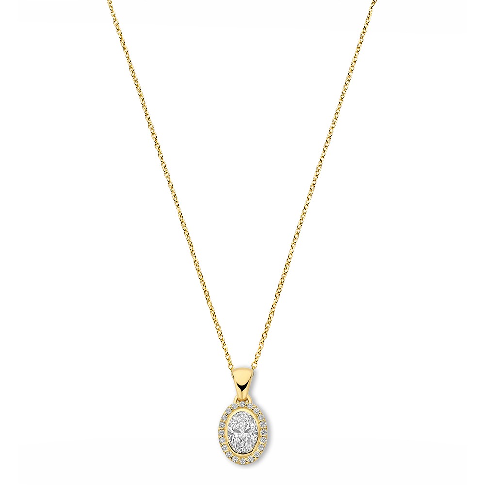 Een verfijnde ketting van 14 karaats goud met een ovale lab grown diamant van 1.00 ct, omringd door een halo van kleine briljant geslepen diamanten. De ovale middensteen wordt mooi benadrukt door de fonkelende rand van kleine diamanten.