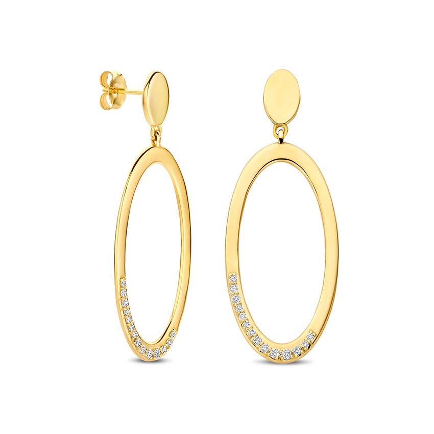 Elegante oorhangers van 14 karaats goud met een verfijnde, ovale vorm. Aan de onderzijde is een rij briljant geslepen lab grown diamanten subtiel verwerkt, die zorgt voor een zachte, sprankelende touch bij elke beweging.