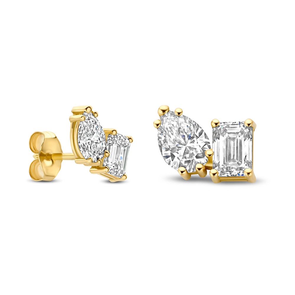 Enerzijds is er een peer geslepen lab grown diamant van 0.50 karaat. Anderzijds is er een emerald geslepen lab grown diamant van 0.50 karaat. De combinatie van deze twee verschillende vormen zorgt voor een sterk visueel contrast. Hierdoor ontstaat een ontwerp dat zowel speels als verfijnd is.