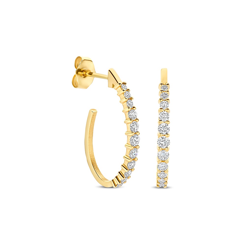 De halfronde vorm zorgt ervoor dat de diamanten mooi langs het oor lopen. Hierdoor ontstaat een harmonieus en elegant geheel. Tegelijkertijd geven de briljanten een sprankelende uitstraling die direct opvalt, zonder te overheersen.