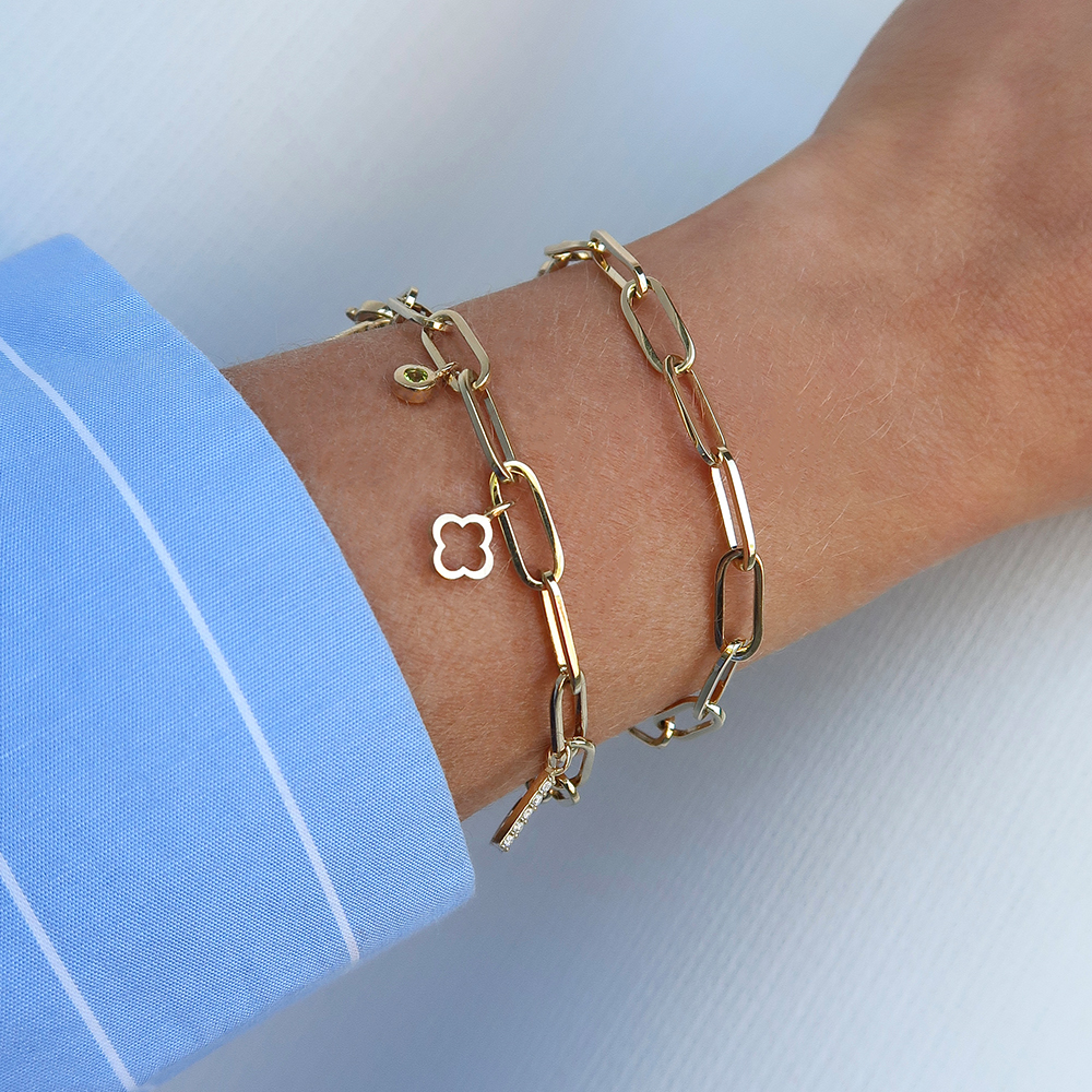 Deze massieve paperclip armband is volledig gemaakt van 14 karaats geelgoud en heeft brede paperclip-schakels van 4,7 mm.