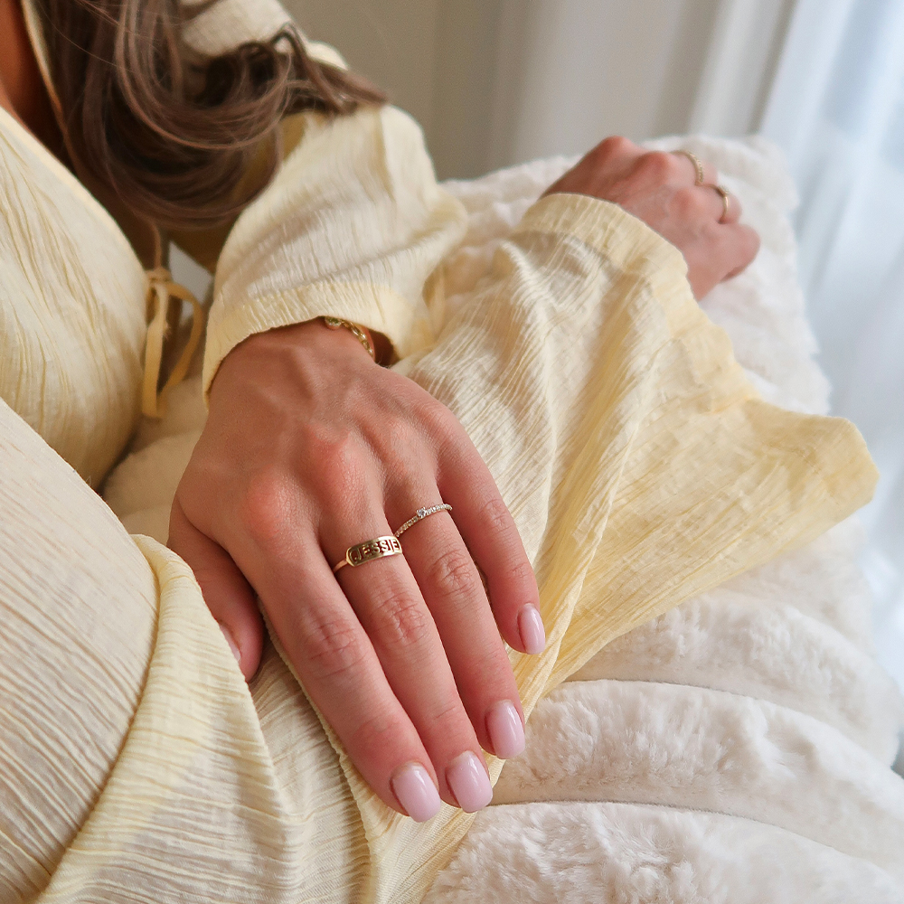 De Bend Ring is een verfijnde 14-karaats gouden ring met een zachte ovale vorm, een subtiel symbool van verbondenheid. Personaliseer de ring met tot 12 tekens, zoals initialen, een naam of een datum in Romeinse cijfers, en maak er een sieraad van dat jouw verhaal vertelt!