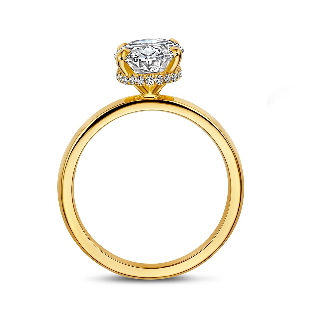 De combinatie van de grote ovale diamant en de verborgen halo creƫert een perfect samenspel tussen klassiek en modern design. Het 14 karaat goud geeft de ring een warme en luxe basis, waardoor hij geschikt is voor zowel dagelijks gebruik als speciale gelegenheden.
