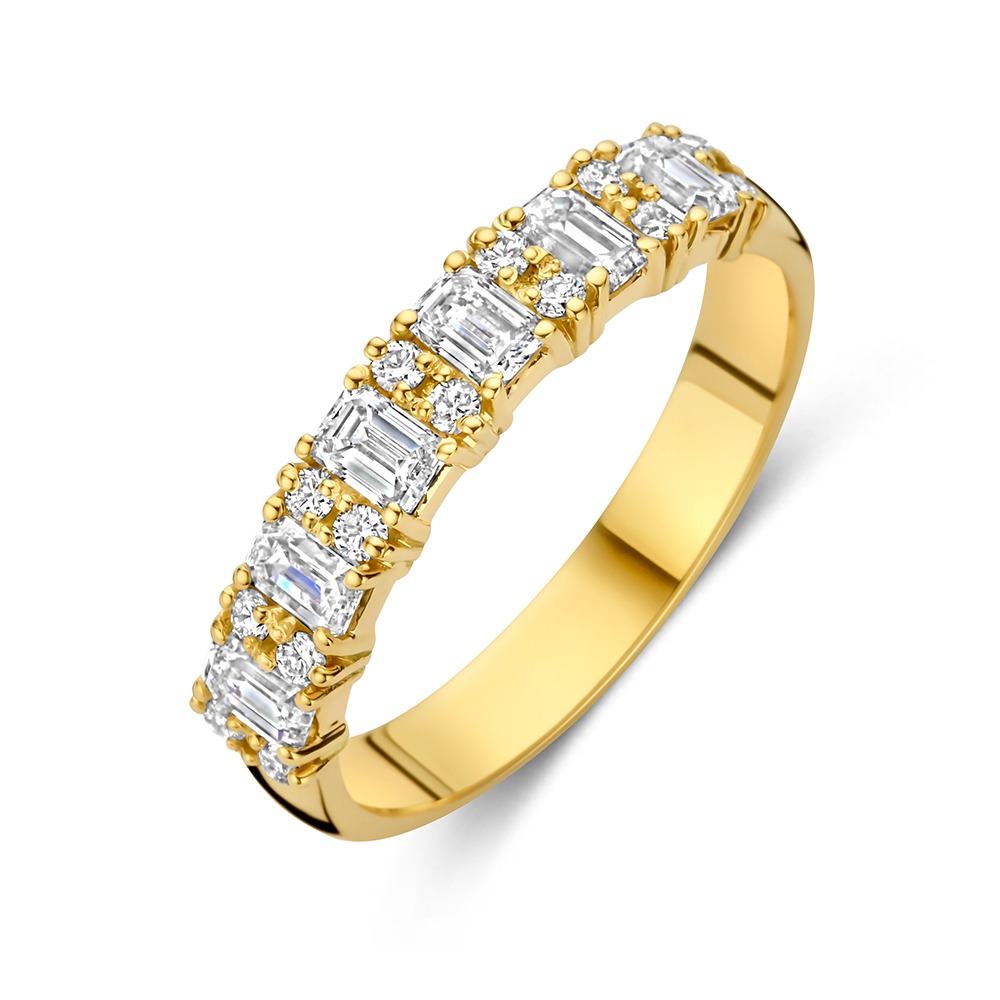 Het 14 karaats goud vormt een warme en tijdloze basis. Hierdoor ontstaat een mooi contrast met de heldere diamanten. Tegelijkertijd zorgt het goud ervoor dat de ring gemakkelijk te combineren is met andere sieraden.