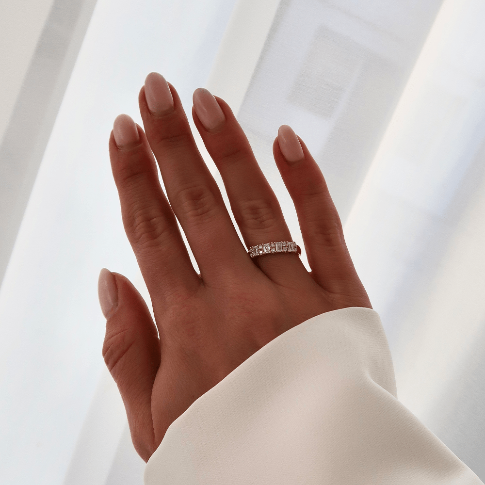 De afwisseling tussen de strakke, geometrische emerald vormen en de ronde briljanten zorgt voor een krachtig contrast. Daarnaast geeft deze combinatie de ring een luxe en eigentijdse uitstraling die direct opvalt.