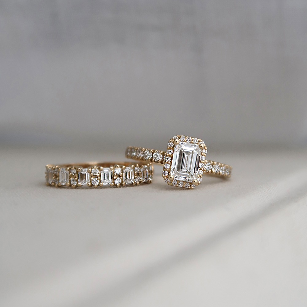 De emerald geslepen diamanten benadrukken de elegante en rustige basis van het ontwerp. Tegelijkertijd zorgen de briljanten voor extra sparkle en levendigheid. Samen creëren ze een harmonieuze balans tussen strak en speels.