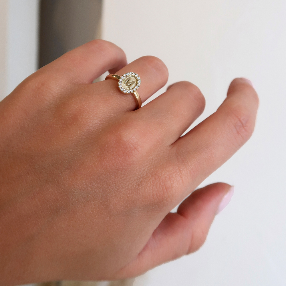 Ontwerp jouw unieke Minioro Ovalia Deluxe ring, gemaakt van 14-karaats goud en bezet met schitterende pavé gezette diamanten.