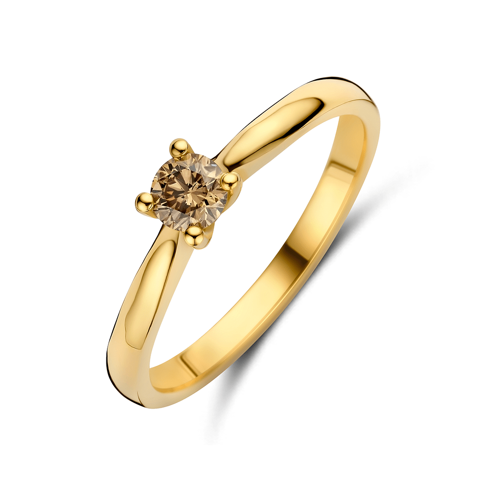 Deze solitair ring heeft een natuurlijke mokka diamant van 0.25 ct in een klassieke vierpoots zetting. De warme bruine kleur van de diamant geeft de ring een unieke en luxe uitstraling, terwijl de open zetkast ervoor zorgt dat de steen prachtig kan schitteren.
