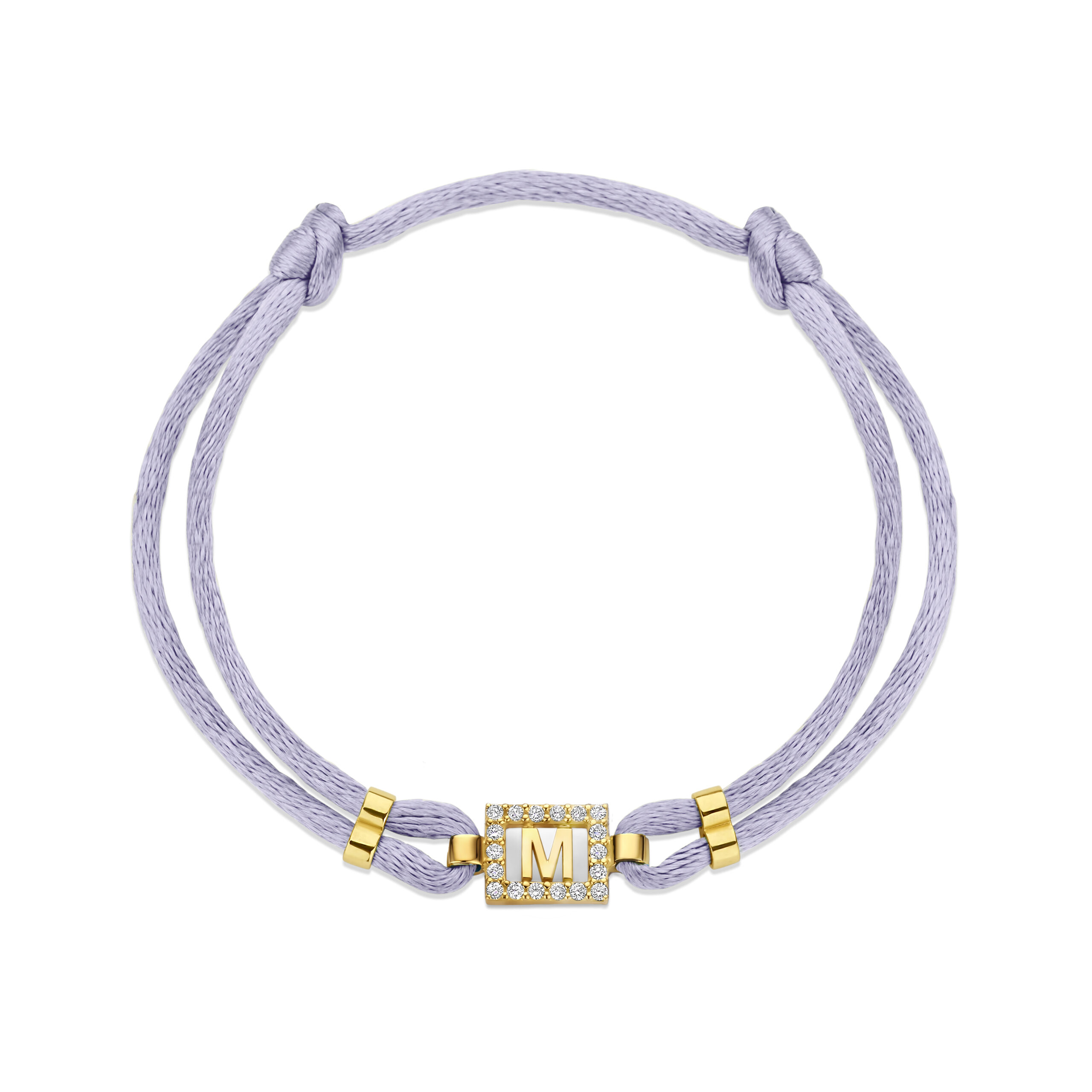 Deze stijlvolle armband combineert een zijdezacht satijnen koord met een 14-karaats gouden bedel, bezet met pavé diamanten, waarin één initiaal naar keuze subtiel is verwerkt.