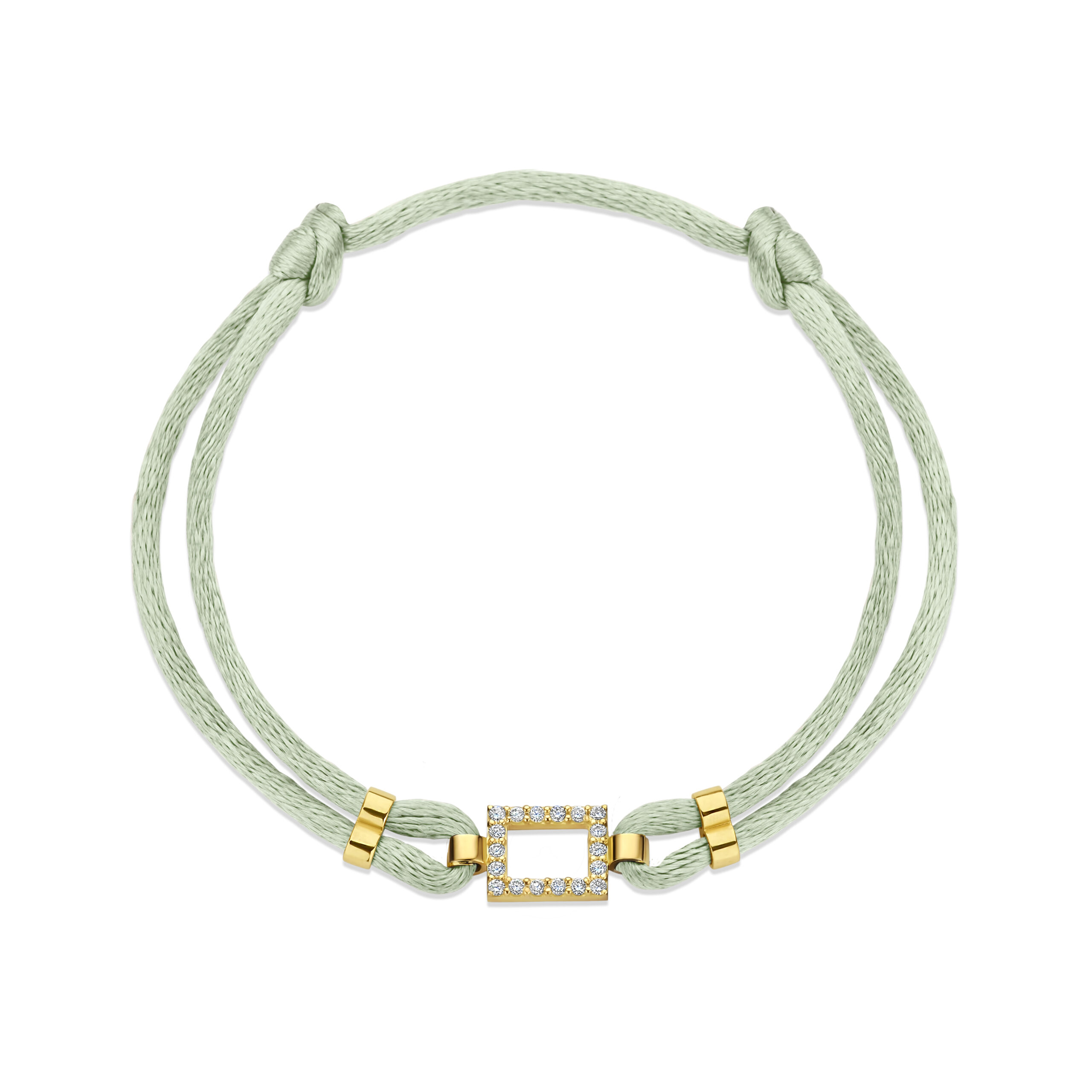 Deze elegante armband combineert een zijdezacht satijnen koord met een verfijnde vierkante bedel van 14-karaats goud, volledig bezet met sprankelende pavé diamanten.