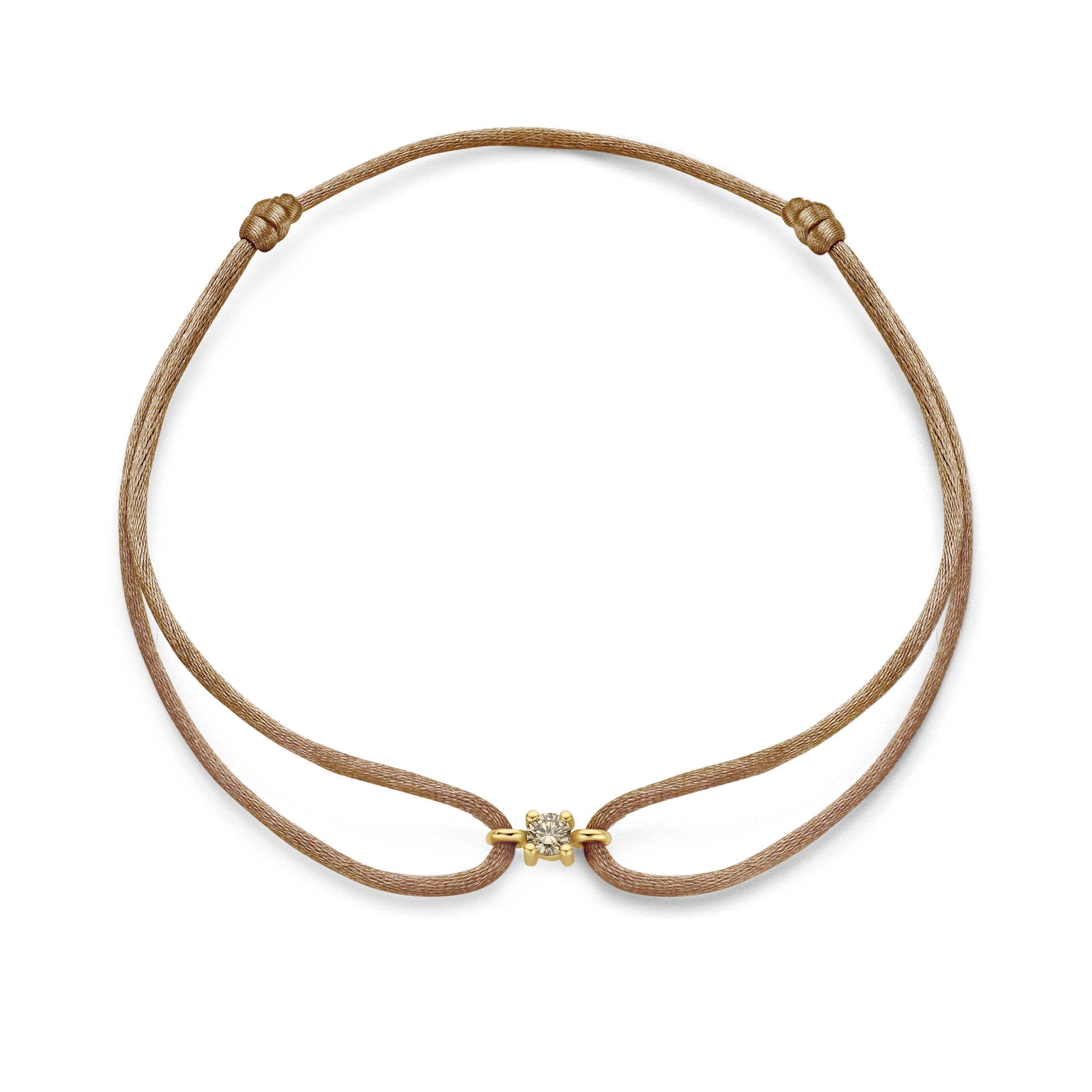 De warme bruine kleur van de mokka diamant geeft de armband een unieke en luxe uitstraling. Het zijdezachte koord vormt een mooi contrast met het goud en de diamant, waardoor het sieraad zowel speels als elegant oogt.