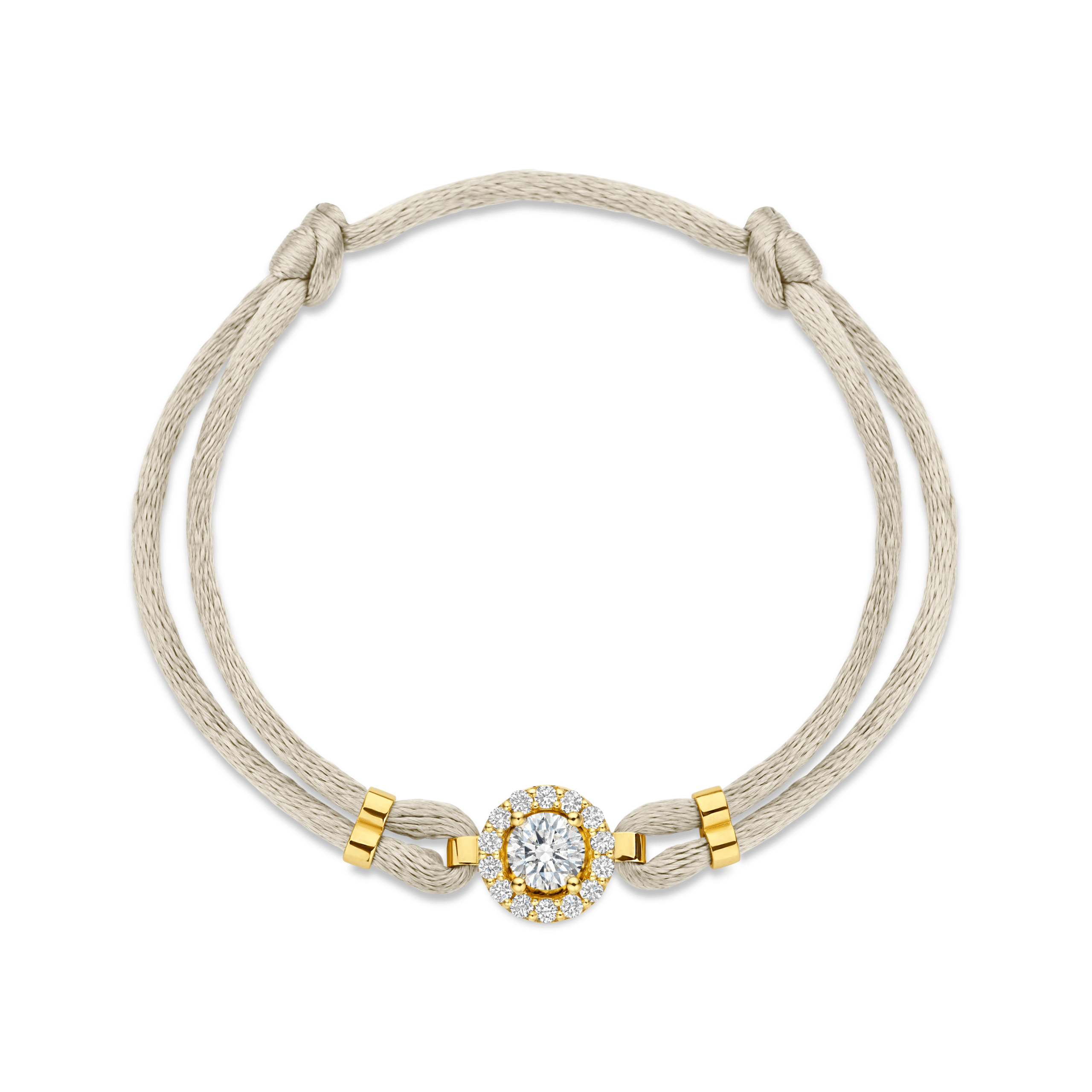 De Satin Halo armband combineert een zacht satijnen koord met een verfijnde halo bedel. In het midden schittert een natuurlijke diamant van 0.25 ct, omringd door een rand van kleine diamanten die de steen extra laten stralen. Het contrast tussen het satijnen koord, de gouden vleugeltjes en de diamanten geeft de armband een moderne en elegante uitstraling.