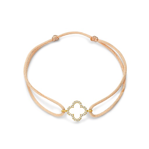 De satin Leaf Pavé heeft een 14-karaats geelgouden Leaf-bedel, bezet met pavé diamanten met een totaalgewicht van 0.14 ct.