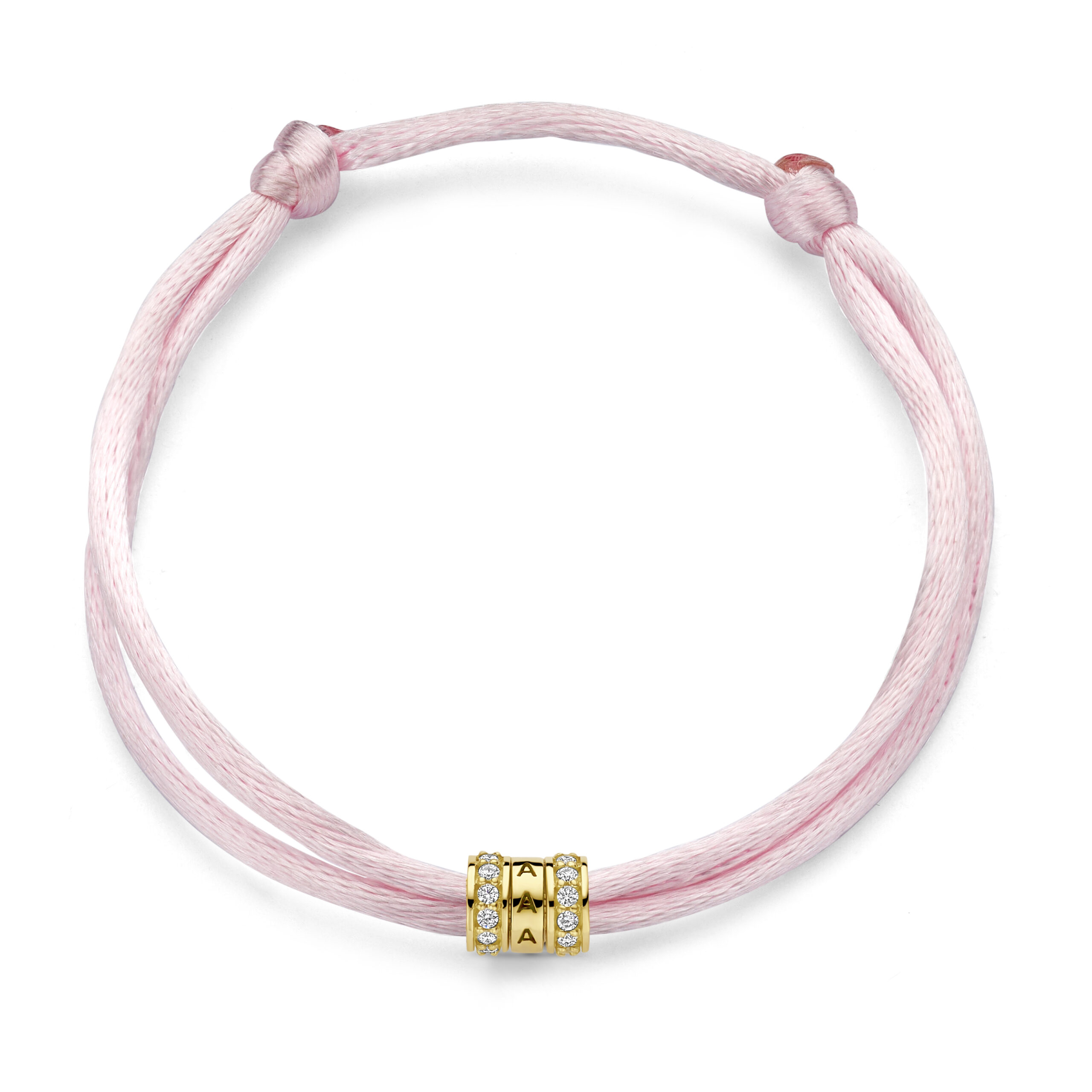 De Satin Tube Small armband combineert een zacht satijnen koord met een subtiel gegraveerde Tube-bedel van 14 karaats goud.